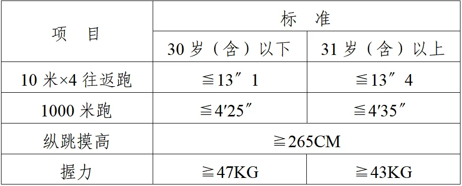 体能测评包括四个项目,分别为1000米跑(男)、4✕10米折返跑、握力、纵跳摸高,每个项目测试次数不超过2次。体能测评采用达标制,任意一项不达标的,即为体能测评不合格,不进入下一环节。体能测评不设缓测、补测,达标标准详见下表。