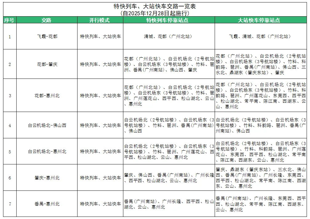 列车编组动态调整:12月31日及1月3日,广清城际“花都—飞霞”快车将由4节车厢改为8节,运力翻倍。