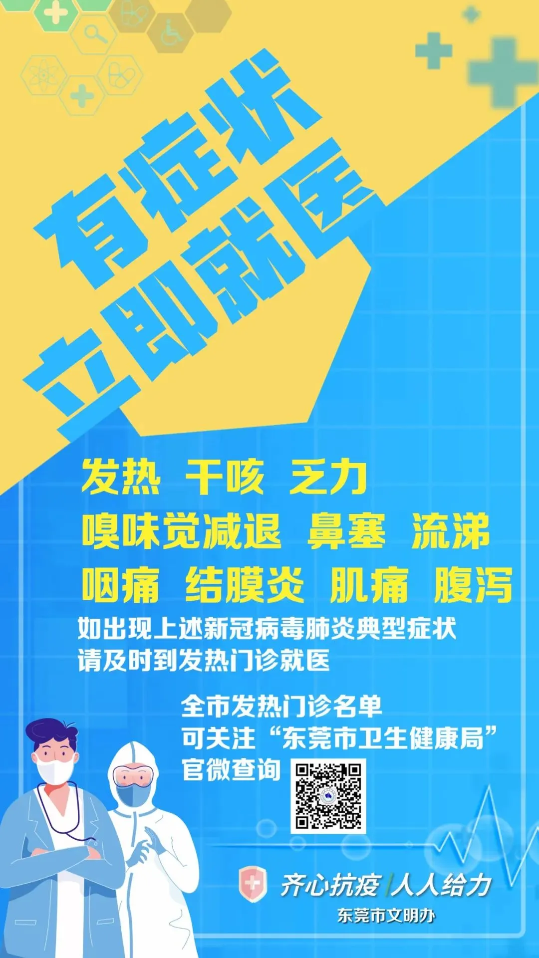 如有出现发热、干咳、乏力、咽痛、嗅 (味)觉减退、鼻塞、流涕、结膜炎、肌痛和腹泻等症状,要佩戴一次性医用口罩及以上级别口罩,及时到就近的发热门诊进行排查和诊疗,就医过程尽量避免乘坐公共交通工具。