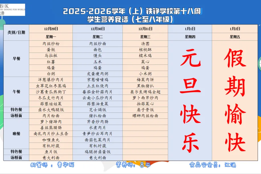 广州市黄埔区铁铮学校每周食谱(12.29-1.2)