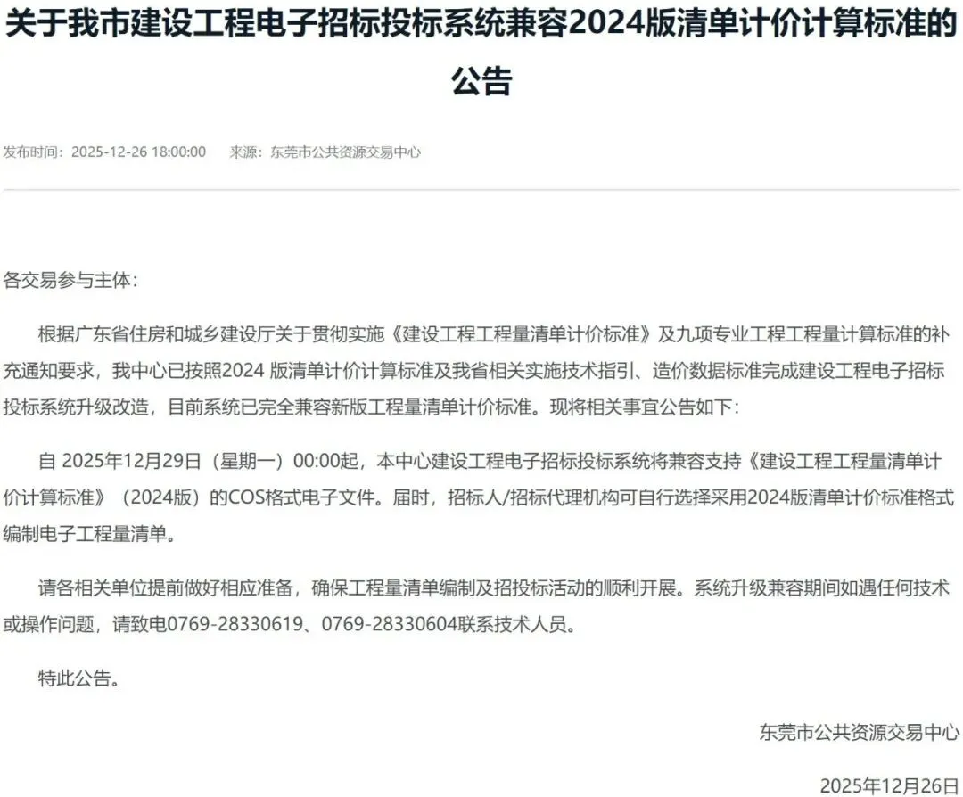 根据广东省住房和城乡建设厅关于贯彻实施《建设工程工程量清单计价标准》及九项专业工程工程量计算标准的补充通知要求,我中心已按照2024 版清单计价计算标准及我省相关实施技术指引、造价数据标准完成建设工程电子招标投标系统升级改造,目前系统已完全兼容新版工程量清单计价标准。现将相关事宜公告如下:自2025年12月29日(星期一)00:00起,本中心建设工程电子招标投标系统将兼容支持《建设工程工程量清单计价计算标准》(2024版)的COS格式电子文件。届时,招标人/招标代理机构可自行选择采用2024版清单计价标准格式编制电子工程量清单。请各相关单位提前做好相应准备,确保工程量清单编制及招投标活动的顺利开展。系统升级兼容期间如遇任何技术或操作问题,请致电0769-28330619、0769-28330604联系技术人员。
