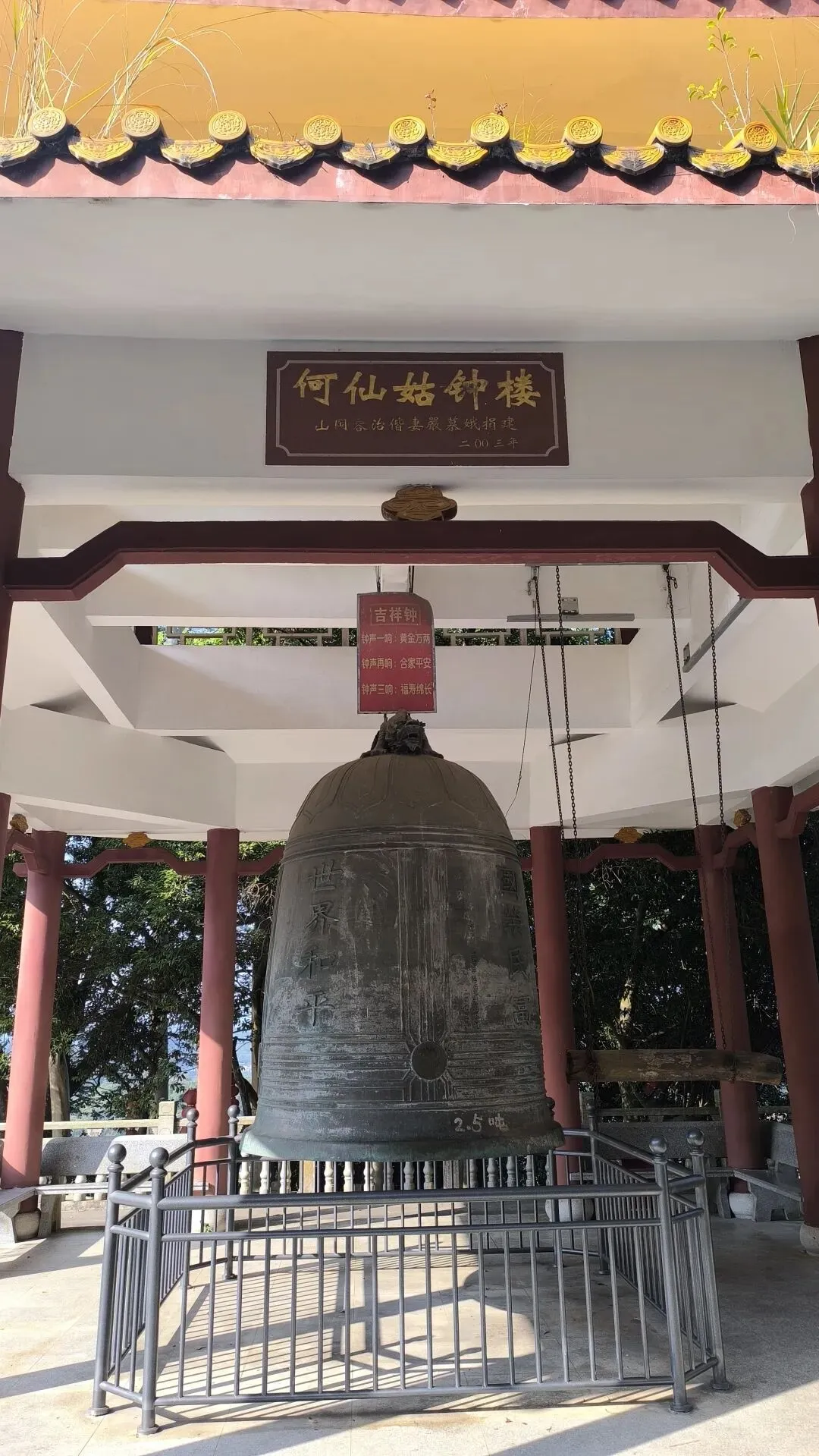何仙姑景区上面有一口大钟名为吉祥钟,我亲自撞响不止三下,钟声悠然,听之使人身心空明,希望如吉祥钟上牌子所述:黄金万两,合家平安,福寿绵长。