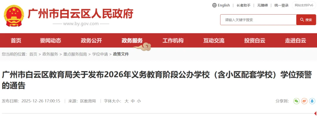 12月26日,广州市白云区教育局发布2026年义务教育阶段公办学校(含小区配套学校)学位预警的通告。