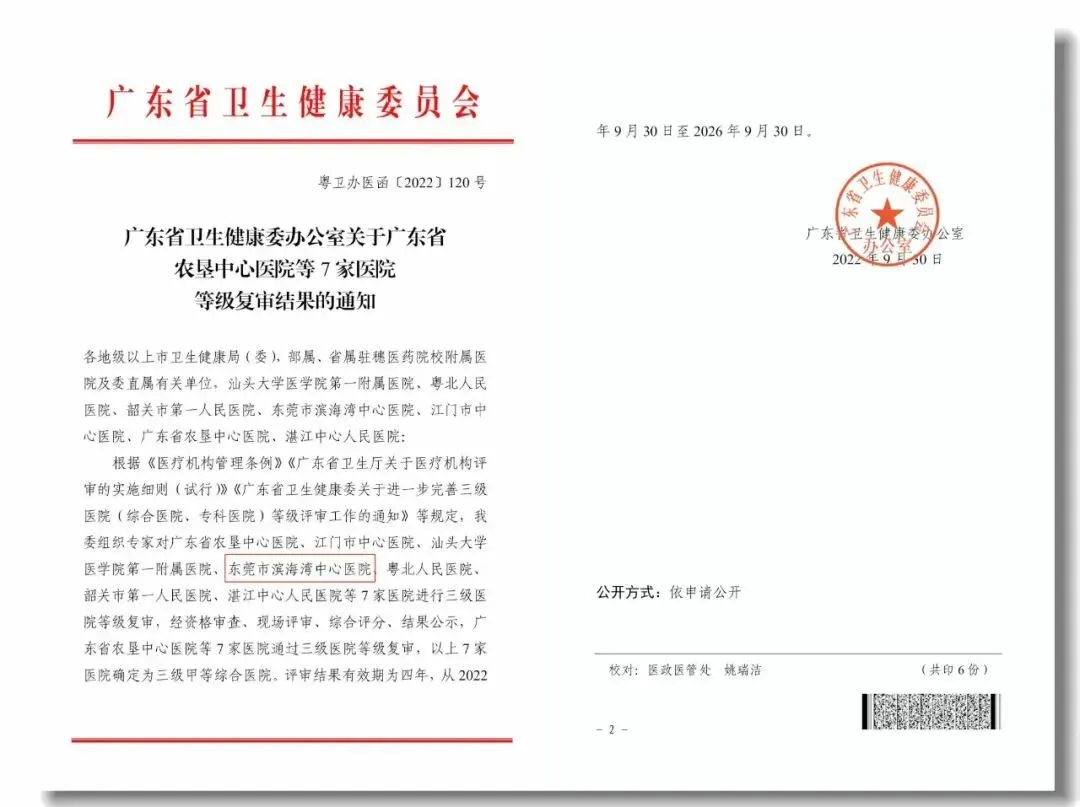 日前,广东省卫生健康委发文公布,经资格审查、现场评审、综合评分、结果公示,包括东莞市滨海湾中心医院在内,全省7家医院通过三级医院等级复审,再次被确定为三级甲等综合医院。