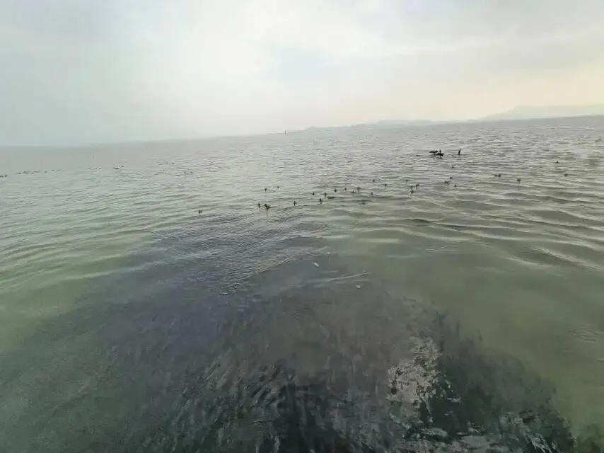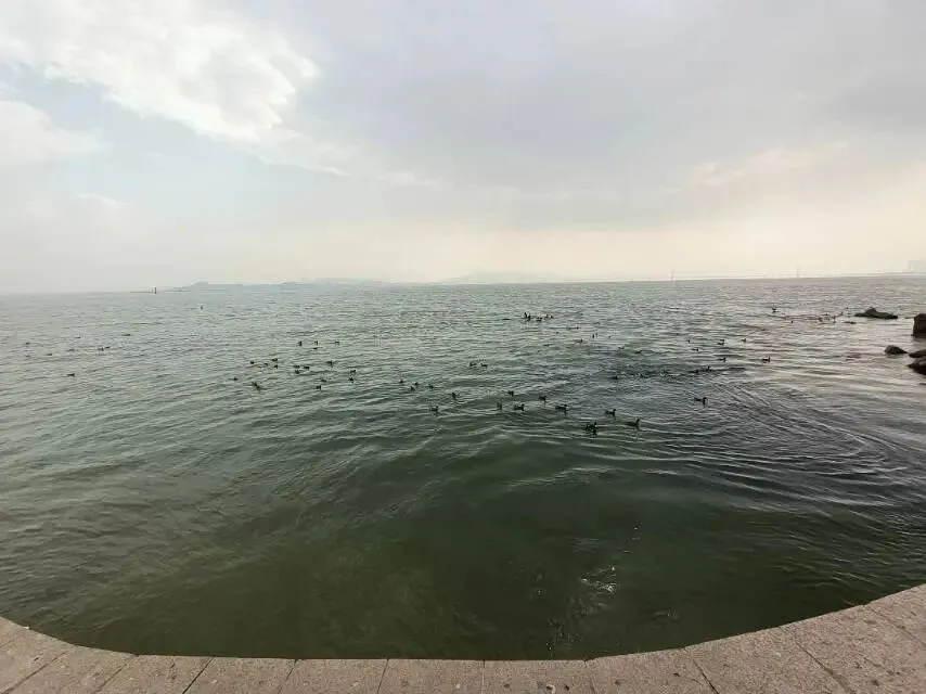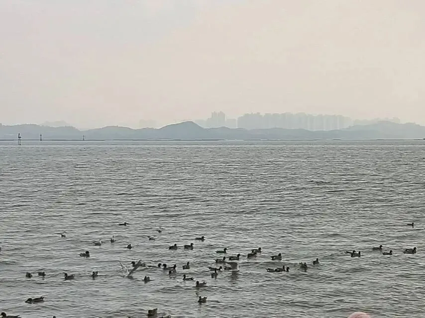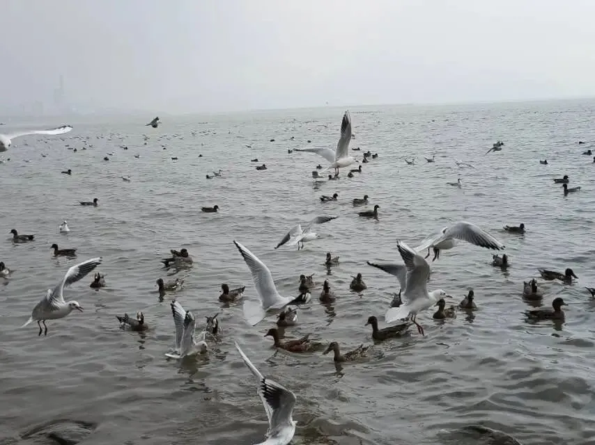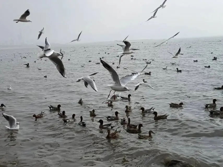 (观鸟) 观鸟栈道上早已架起“长枪短炮”。我选了块礁石坐下,身后的海面突然成了流动的画布:红嘴鸥扑棱着翅膀掠过镜头,野鸭用红掌划开绿波,远处鸬鹚在暗礁上晒翅,像一群披着黑斗篷的哨兵。最惊喜的是黑脸琵鹭——扁平如琵琶的长嘴在浅滩扫动,黑白羽毛在阳光下亮得晃眼。这种全球仅存数千只的濒危鸟类,此刻正旁若无人地觅食,仿佛在说:“人类,谢谢你守住这片滩涂。”