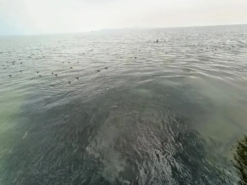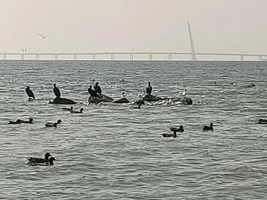 (尾声) 涨潮的海水漫过礁石时,桥下突然沸腾:数万条乌鱼聚成青黑色漩涡,在水面吐着泡泡。头顶上,苍鹭正盯着它们盘旋;浅滩里,白鹭的尖喙如利剑般刺向水面。自然的法则如此奇妙:鸟儿与鱼群互为风景,人类与候鸟共享海湾。