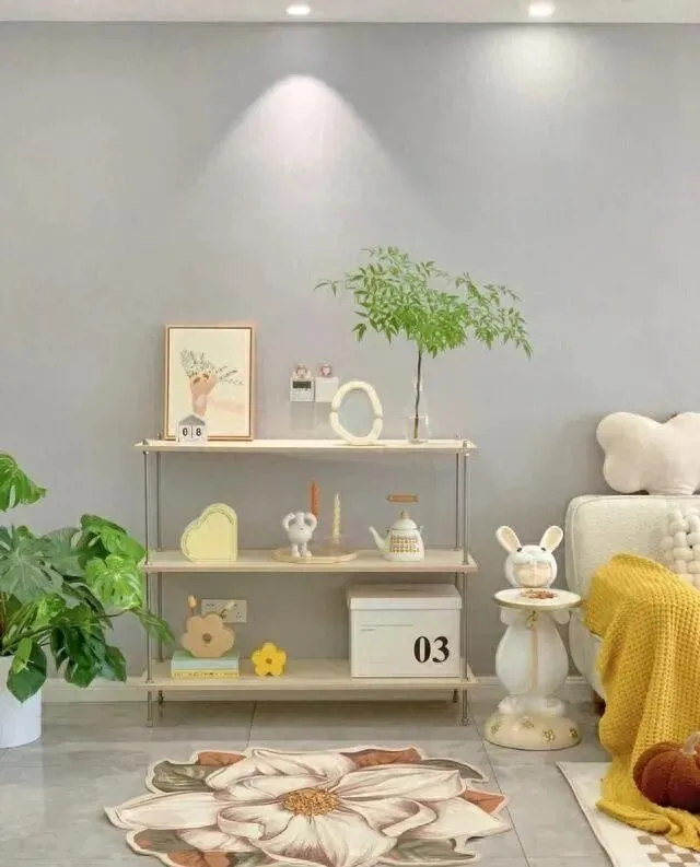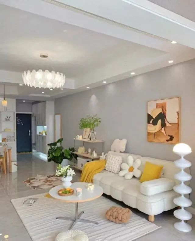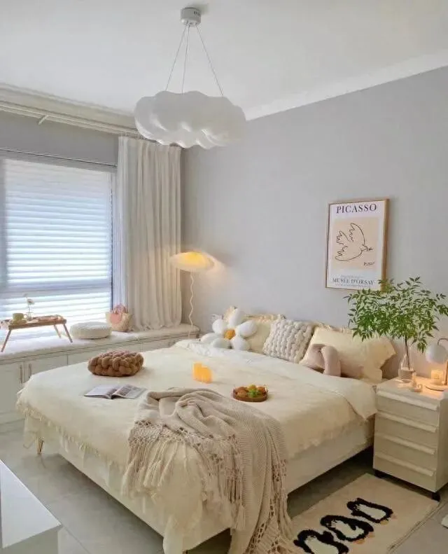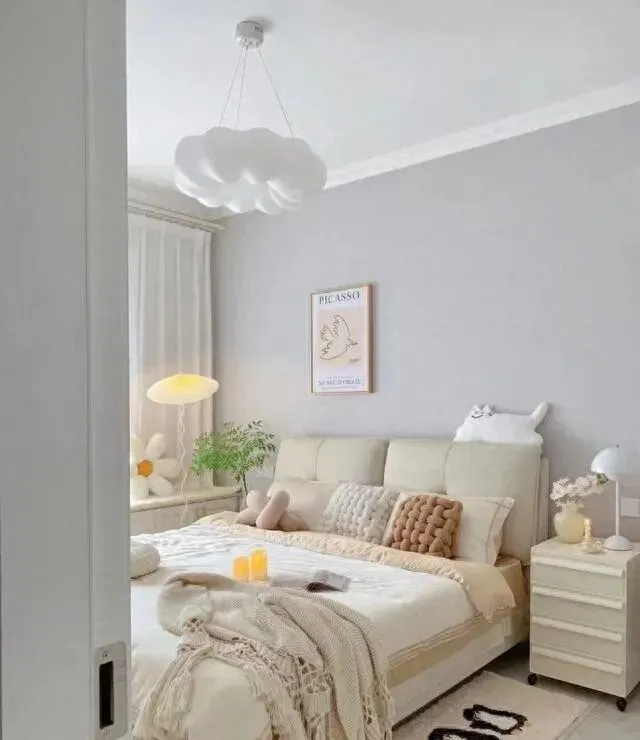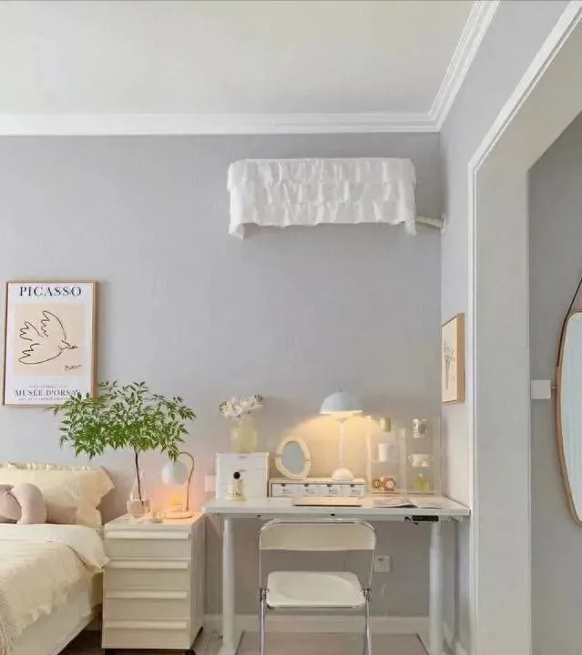 墙漆是灰白色 , 不是纯白。 纯白太冷 , 灰白刚好 , 显得安静又不压抑。