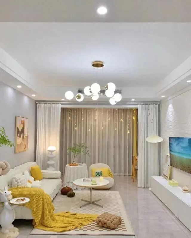 他们挂了星星霓虹灯 , 晚上亮起来 , 浪漫得不行。 窗帘选的是纱帘 , 白天透光 , 晚上拉上有私密感。