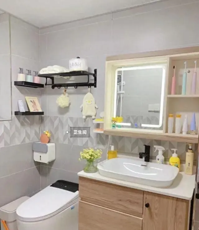 储物是亮点。 悬空浴室柜 , 底下好打扫。 镜柜打开全是收纳格 , 瓶瓶罐罐全藏里面 , 台面永远清爽。
