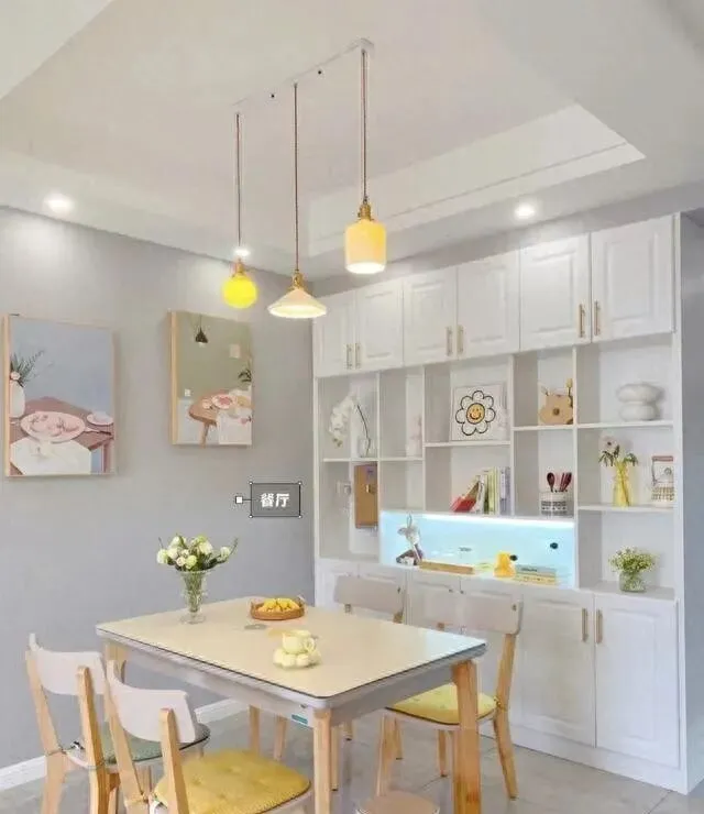 餐柜设计得实用 , 餐具、杂物都有地方放。 不像有些家 , 餐桌旁边乱七八糟堆一堆。