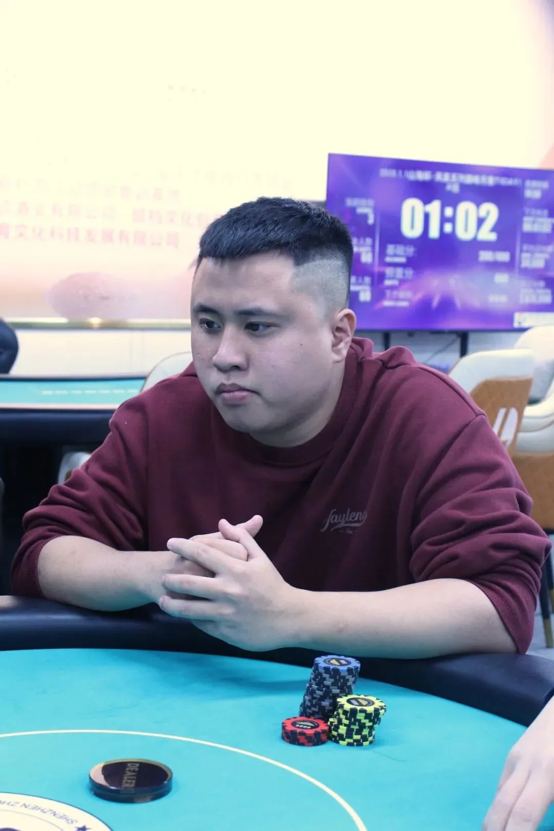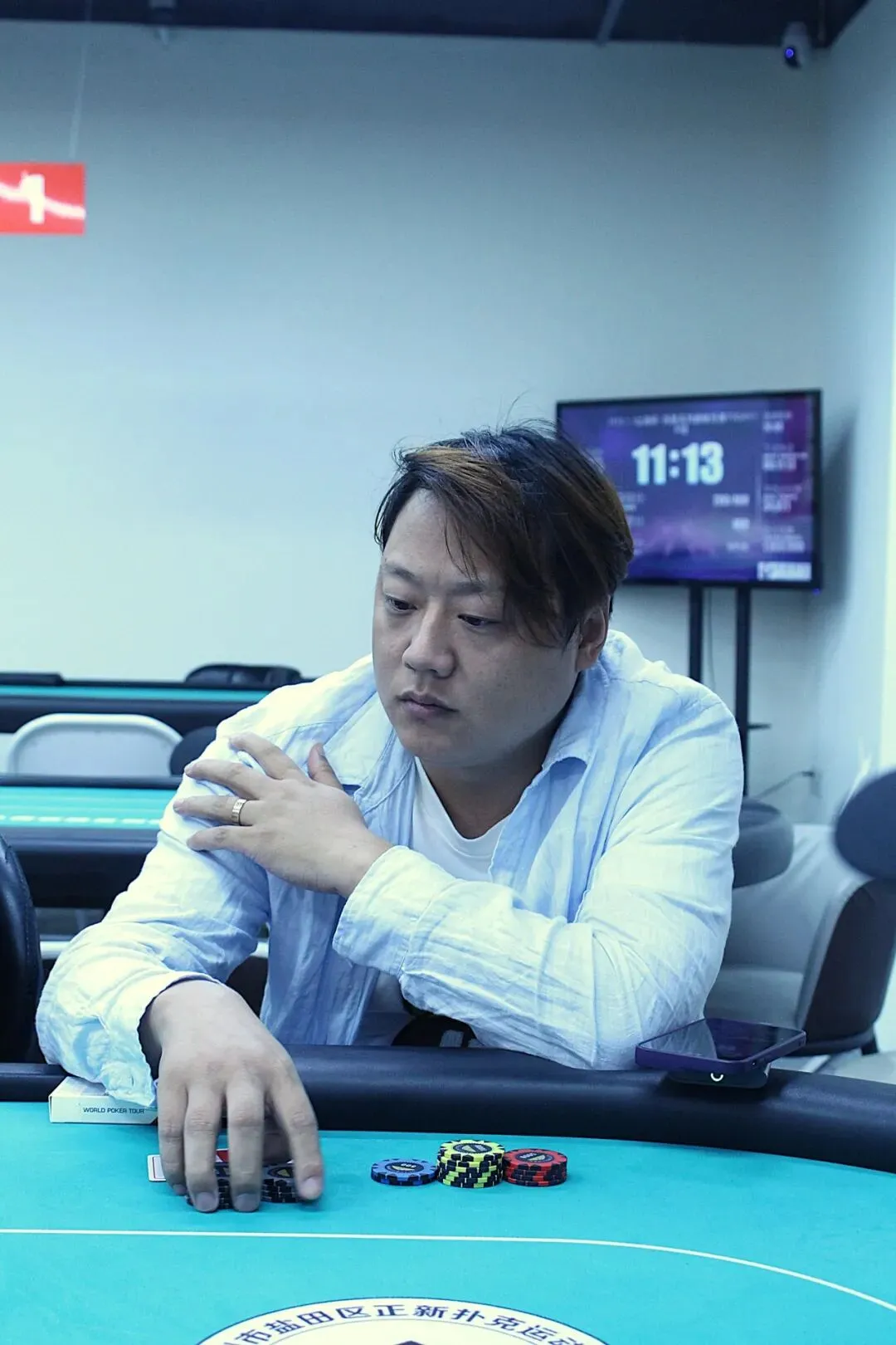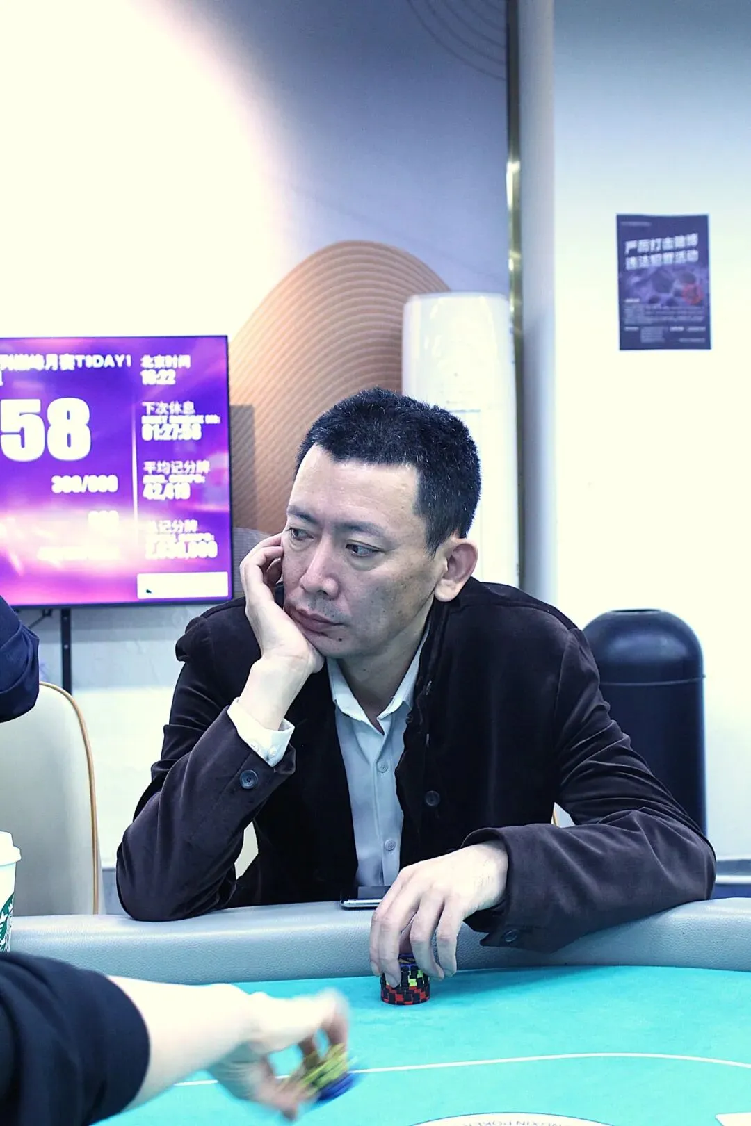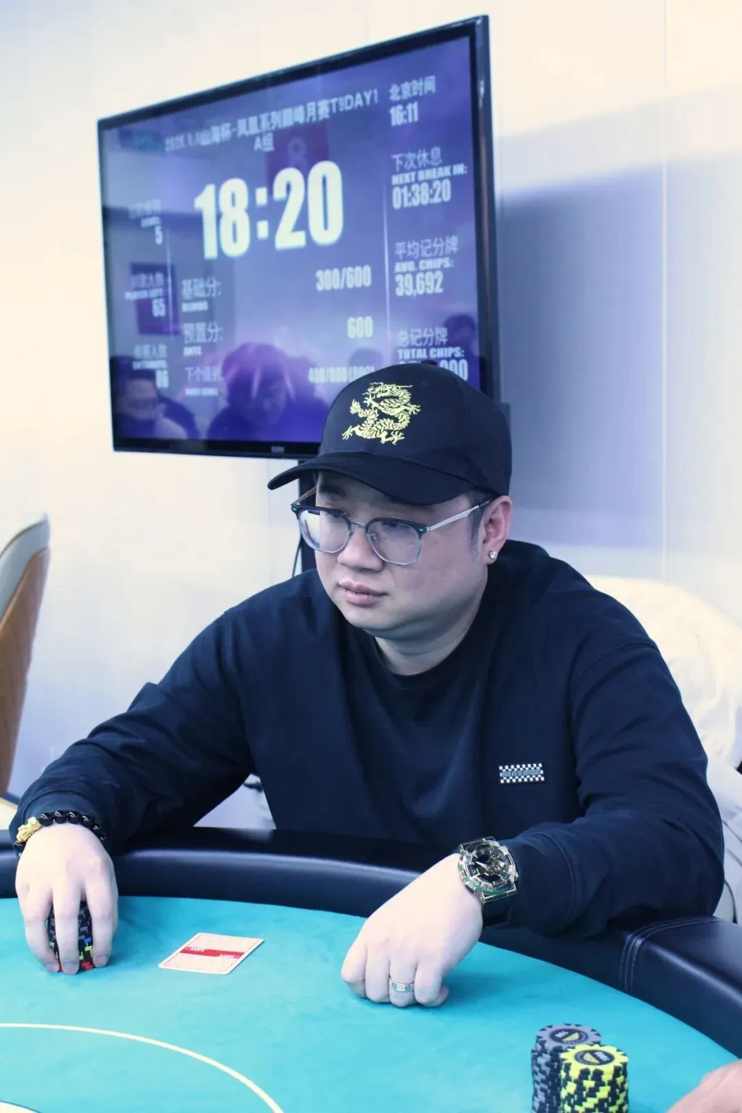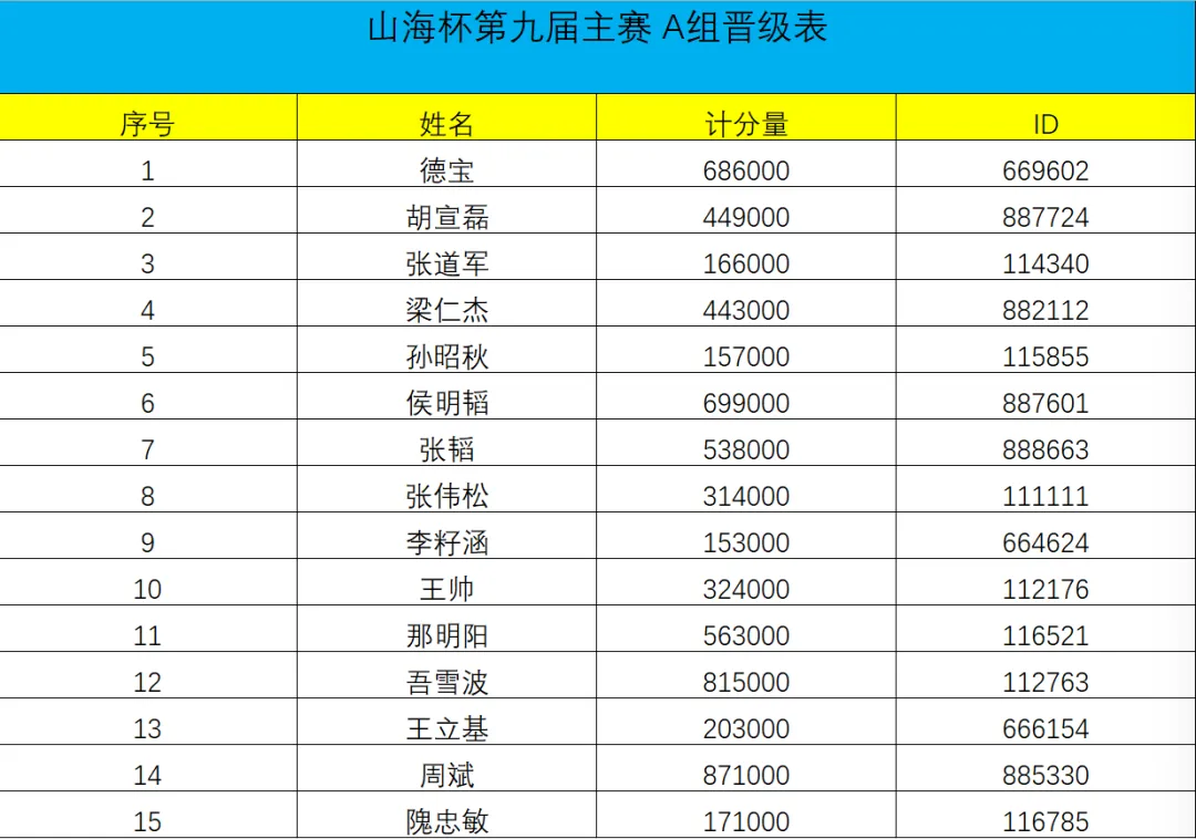 山海杯主赛的奖励圈为参赛人数的11%,DAY1A组的参赛人数为140人次,奖励圈15人,当比赛剩余16人时,场上进行同步手牌。