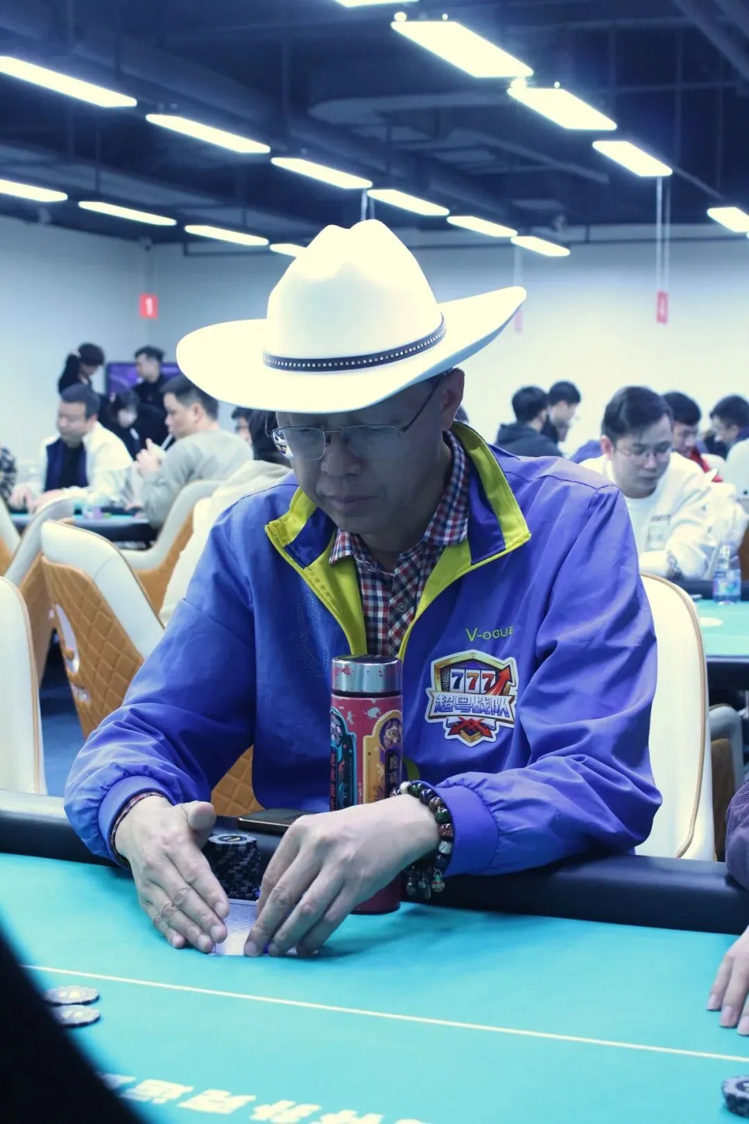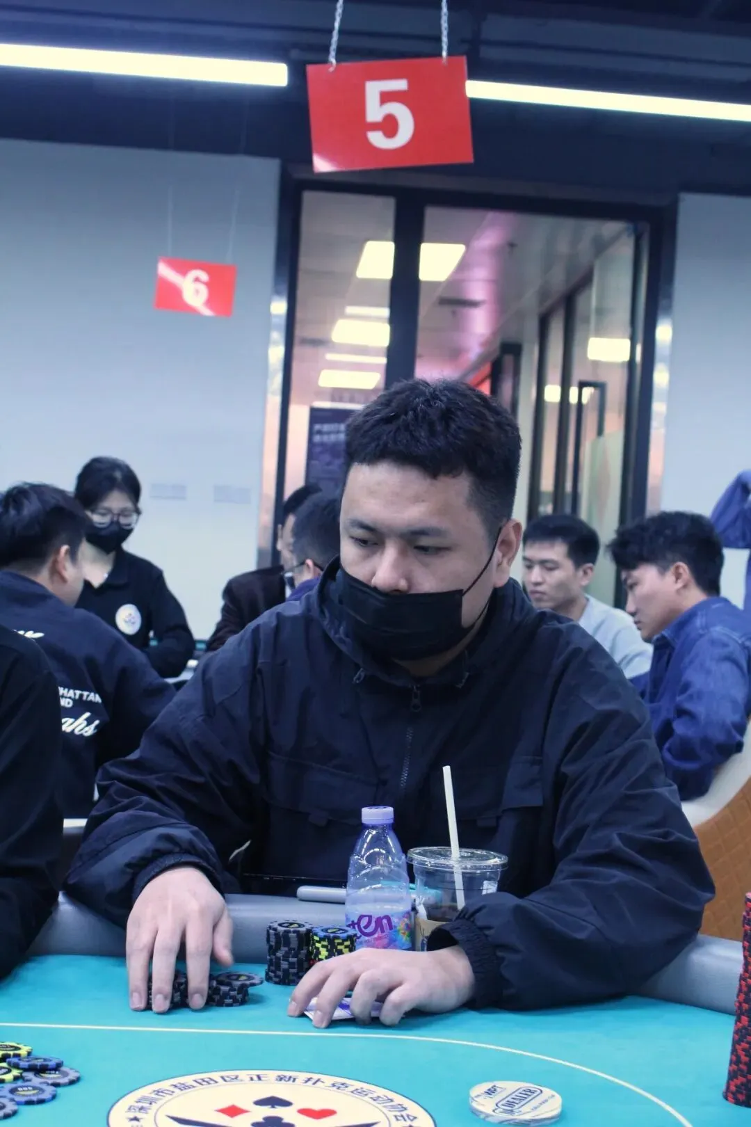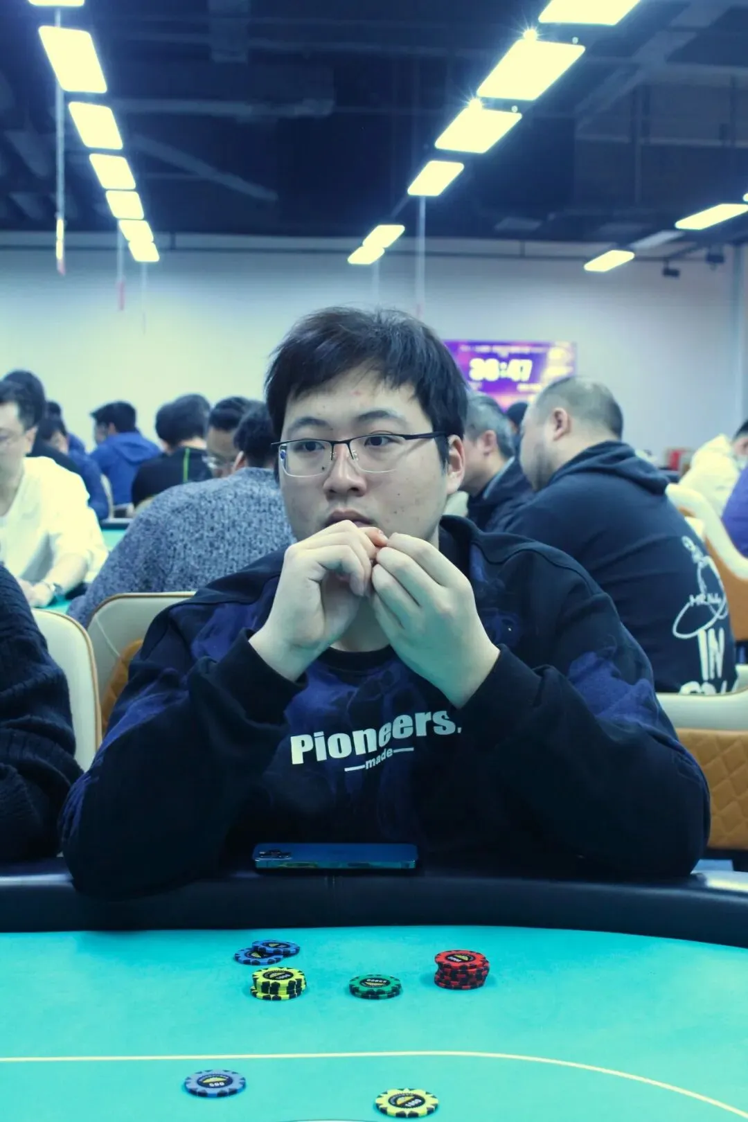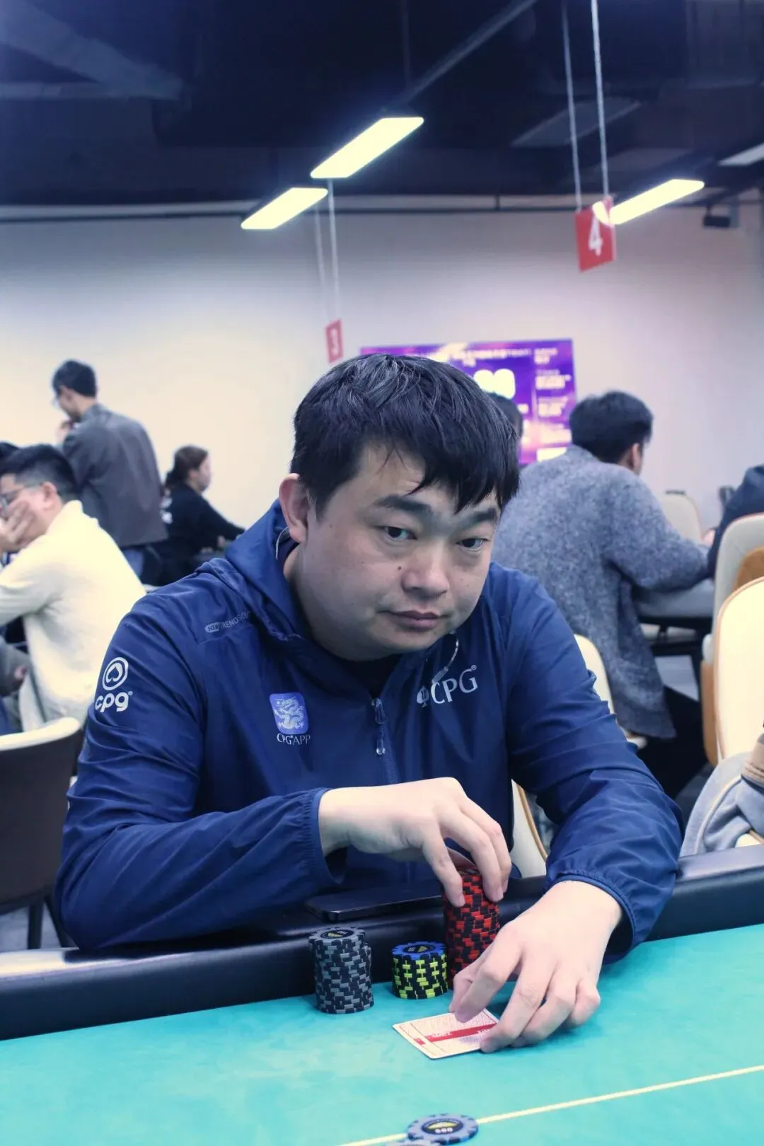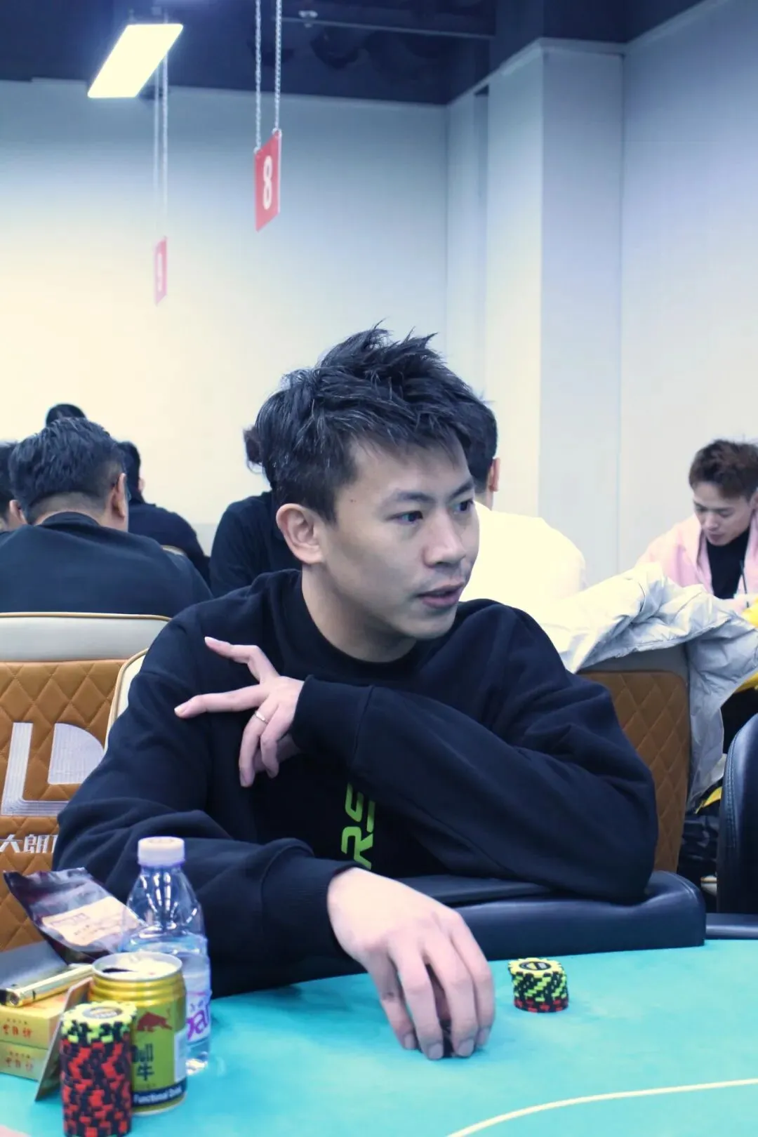 山海杯主赛的奖励圈为参赛人数的11%,DAY1A组的参赛人数为140人次,奖励圈15人,当比赛剩余16人时,场上进行同步手牌。