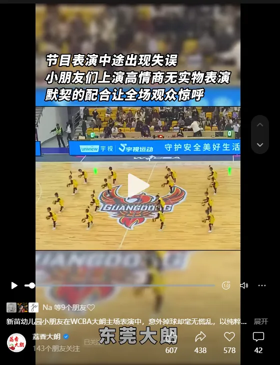 2025年12月28日晚,WCBA常规赛第十轮中场休息时,一群来自巷尾新苗幼儿园的“篮球宝贝”踏上了专业球场中央。音乐响起,十几个五六岁的孩子随着节奏拍球、转身、变换队形。表演的过程中,一个小朋友球掉了,同场表演的小朋友团结默契配合他进行无球表演,同时在表演的过程中,把球踢回来给掉球的小朋友,最终大家一起全力把表演很好的完成了。