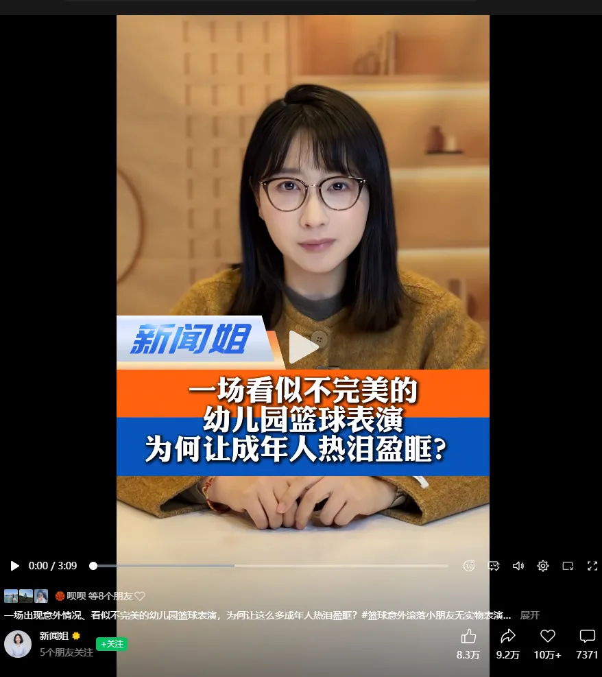 这段不过十来秒的“小插曲”,被现场观众拍下并上传网络,迅速走红网络,引发许多网友纷纷点赞,连全网粉丝超4200万的“新闻姐”转发视频并配文《一场看似不完美的幼儿园篮球表演,为何让成年人热泪盈眶》。她点评:“这就是体育精神最纯粹的样子,孩子们教会了我们什么是团队,篮球文化已经融入了这些孩子的血液”。