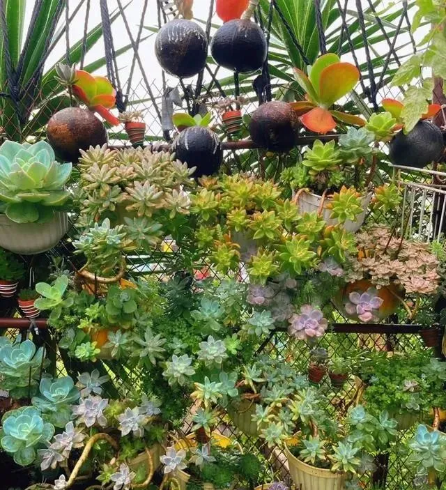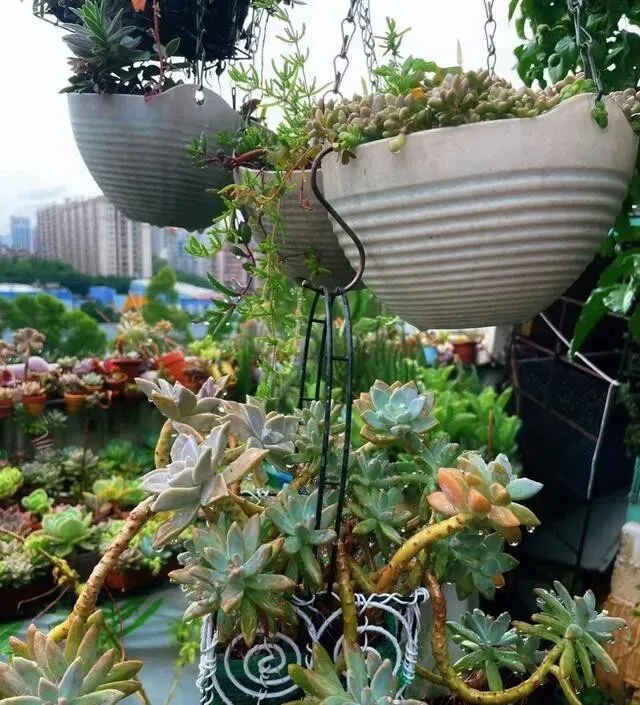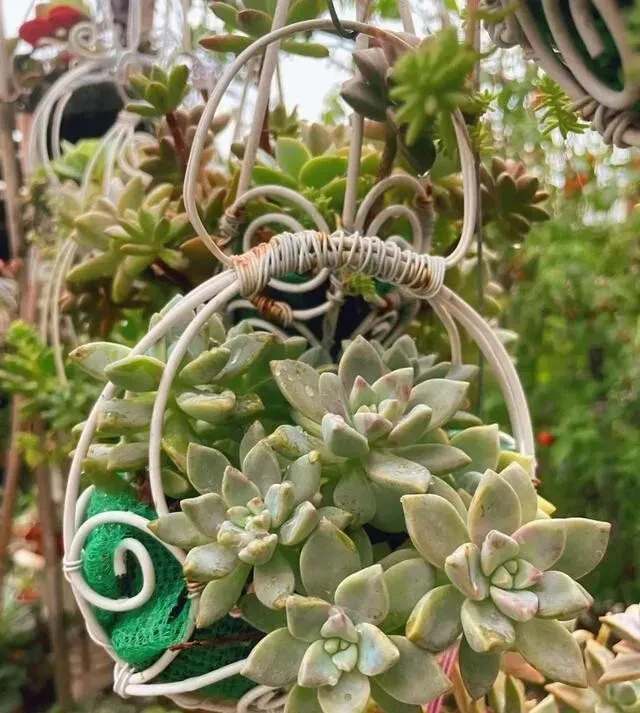 还有悬挂式花盆 , 也是自己DIY的 , 挂起来养多肉 , 空间利用率高 , 看着也特别浪漫。