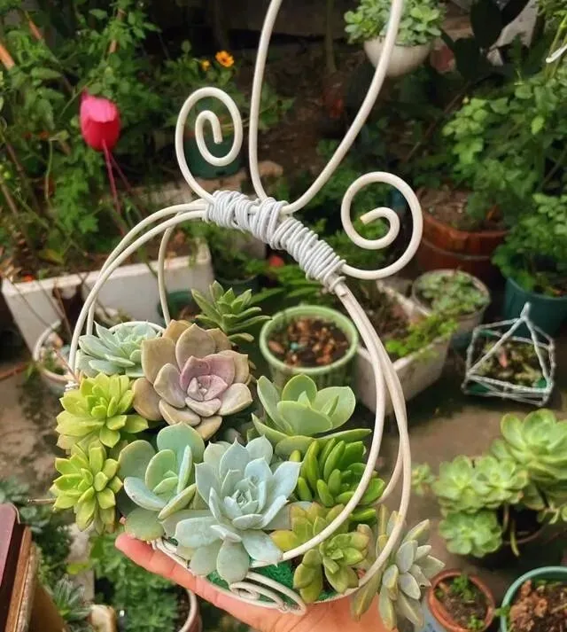 最得意的是月亮船 , 3根白色铁丝弯一弯 , 做成月亮的样子 , 再把多肉种上去 , 又美又有诗意~