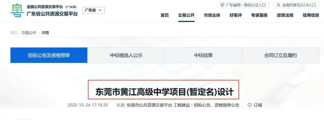 广东省公共资源交易平台发布“东莞市黄江高级中学(暂定名)设计”招标公告,标志着这所市直属公办高中正式启动前期工作。该项目由东莞市教育局推进,总投资4.687961亿元,规划建成72班规模、提供3600个学位,建设总工期约38个月,计划于2028年9月投入使用。