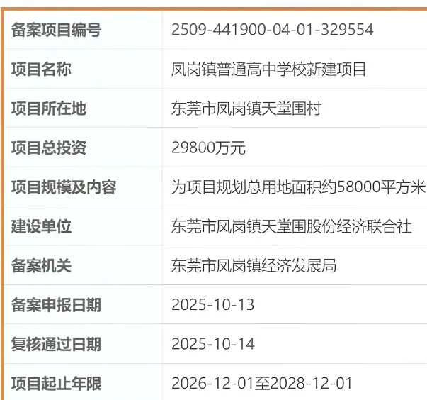 凤岗镇普通高中学校新建项目,正式完成投资备案。