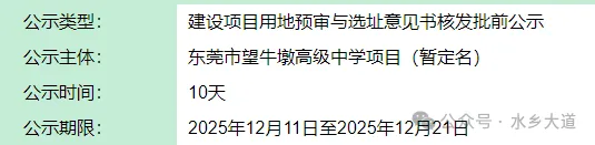 东莞市望牛墩高级中学项目(暂定名)正式进入用地预审与选址审批阶段。