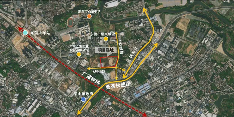 据公告显示,该项目位于茶山镇铁路沿线(二区),A线道路及B线道路交汇处,临近桑茶快速路,与茶山镇人民政府和石龙中学直线距离均约600米左右。