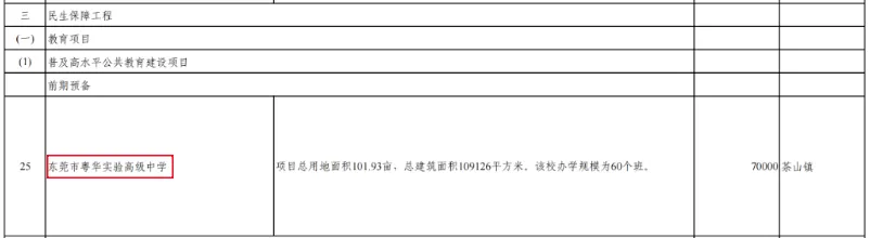 7月1日,东莞滨海湾未来学校高中校区动工,项目估算总投资约7亿元,办学规模为48个高中班,建成后将新增2400个高中学位,计划2027年6月完工,秋季开学。