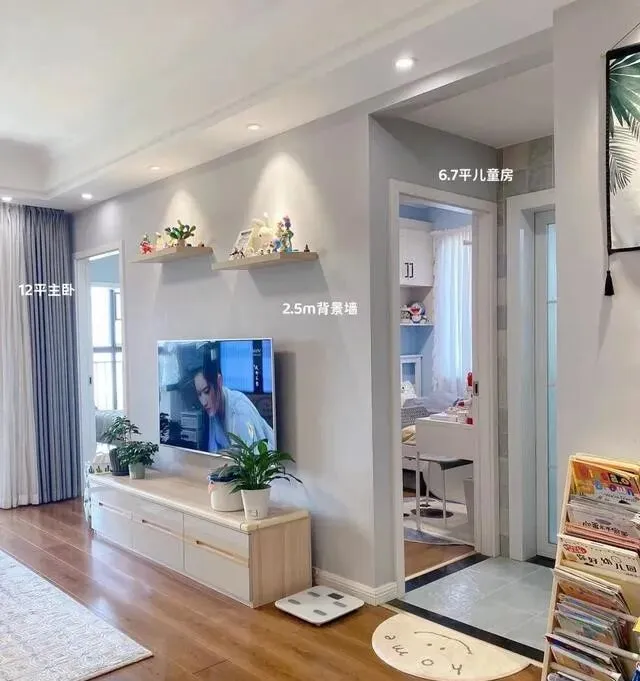 就是白墙 , 配了个1.8米的电视柜 , 大小刚刚好 , 底下还能收纳 , 这不比做一面花里胡哨的背景墙香吗?
