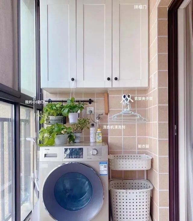 阳台那边做了洗衣区 , 装了吊柜放日用品 , 动线很顺 , 洗完衣服直接晾 , 不用跑来跑去的。