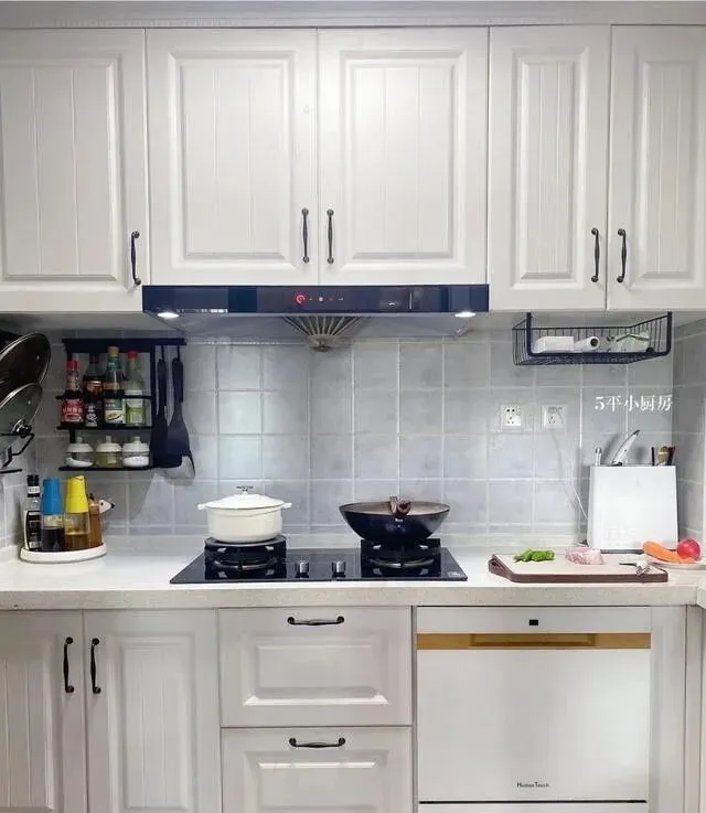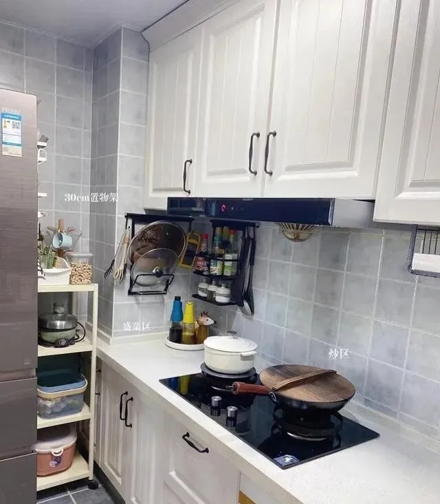 墙上装了置物架 , 调料啊刀具啊锅盖啊全上墙 , 台面就干干净净的 , 做饭的时候拿东西也方便。