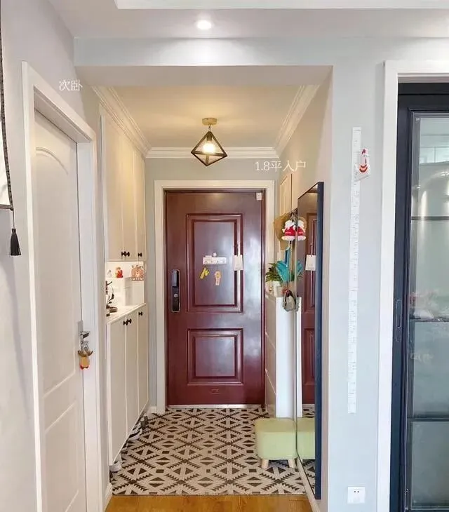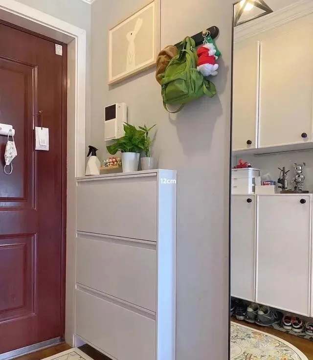 鞋柜是超薄款的 , 入户门朝内开 , 完全不影响 , 小户型可以抄作业!
