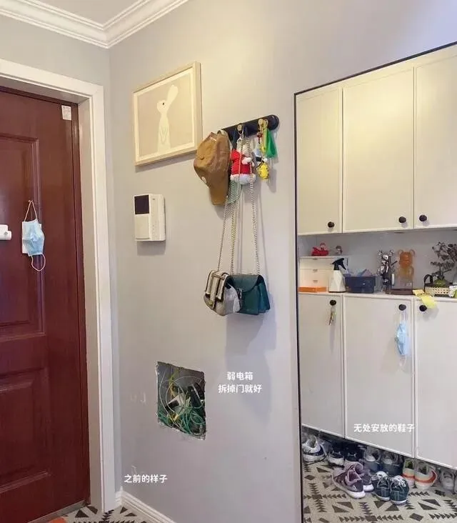 玄关做了个半米高的鞋柜 , 下面放鞋 , 上面储物。