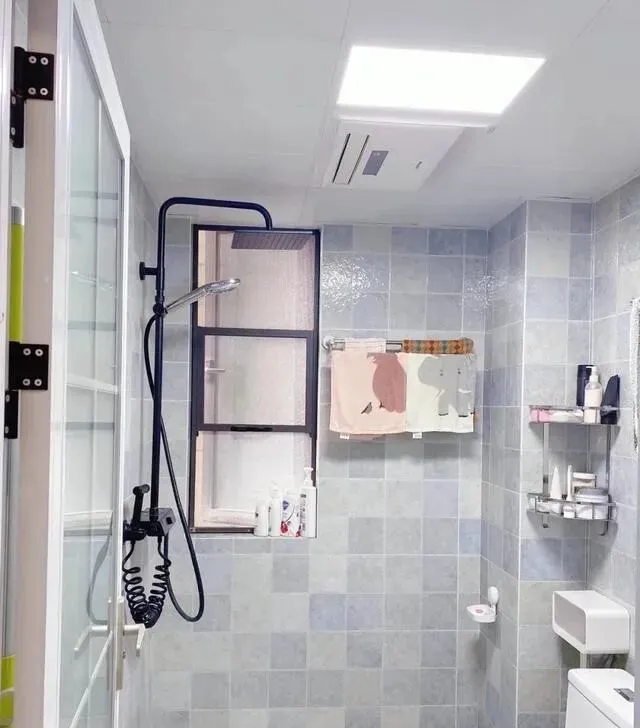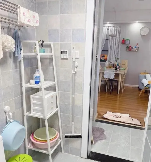 角落还加了几层置物架 , 把那些不起眼的空间都利用上了 , 卫生间看着就清清爽爽的~