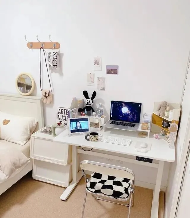 床边还放了张1.2米的书桌 , 可以办公可以化妆 , 功能性很强。