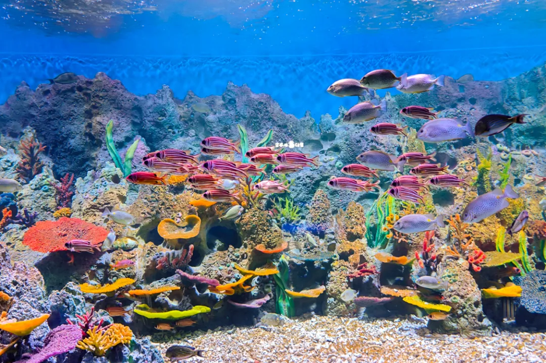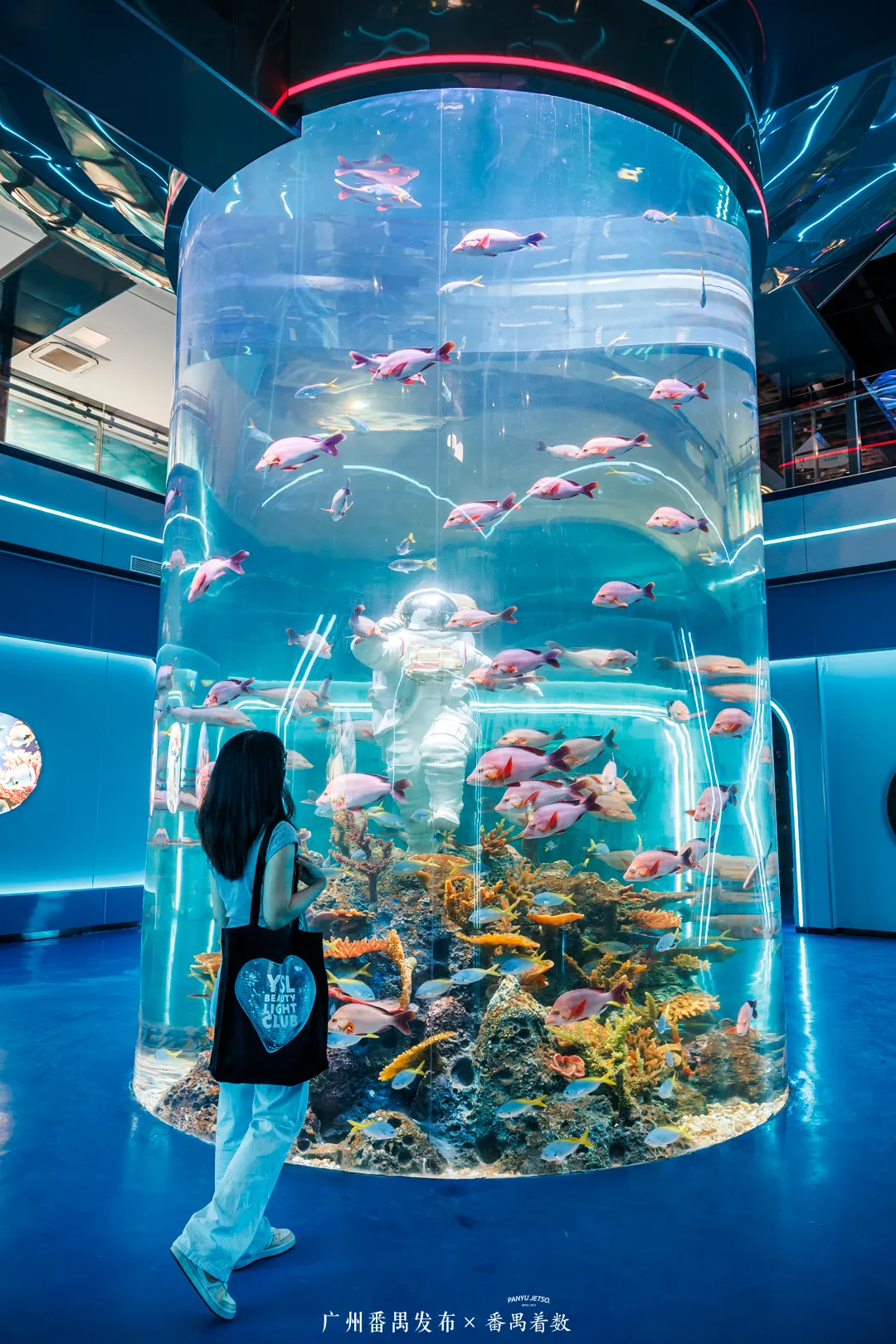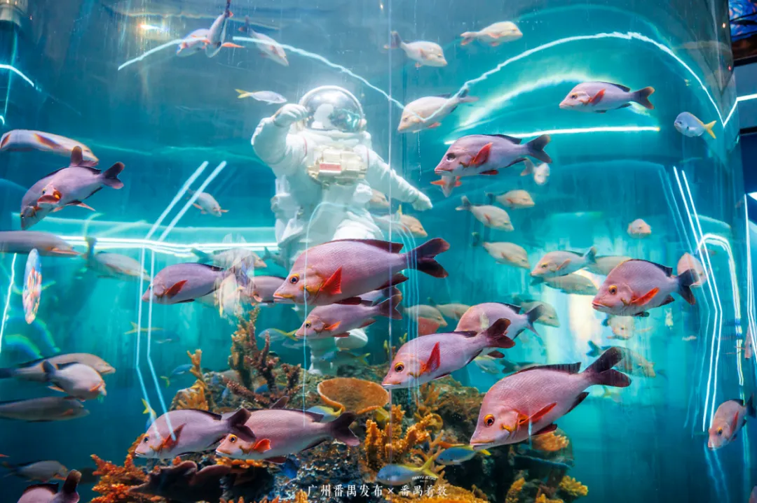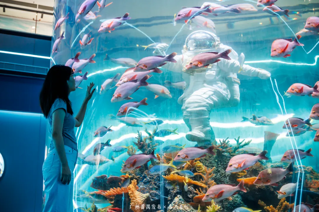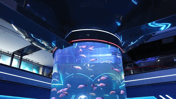 绝对会让你惊叹——成千上万条热带鱼在巨型圆柱中环绕游动,站在缸前拍照,仿佛被蓝色星球温柔拥抱。