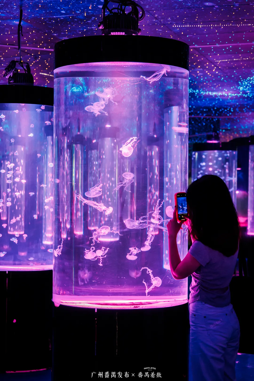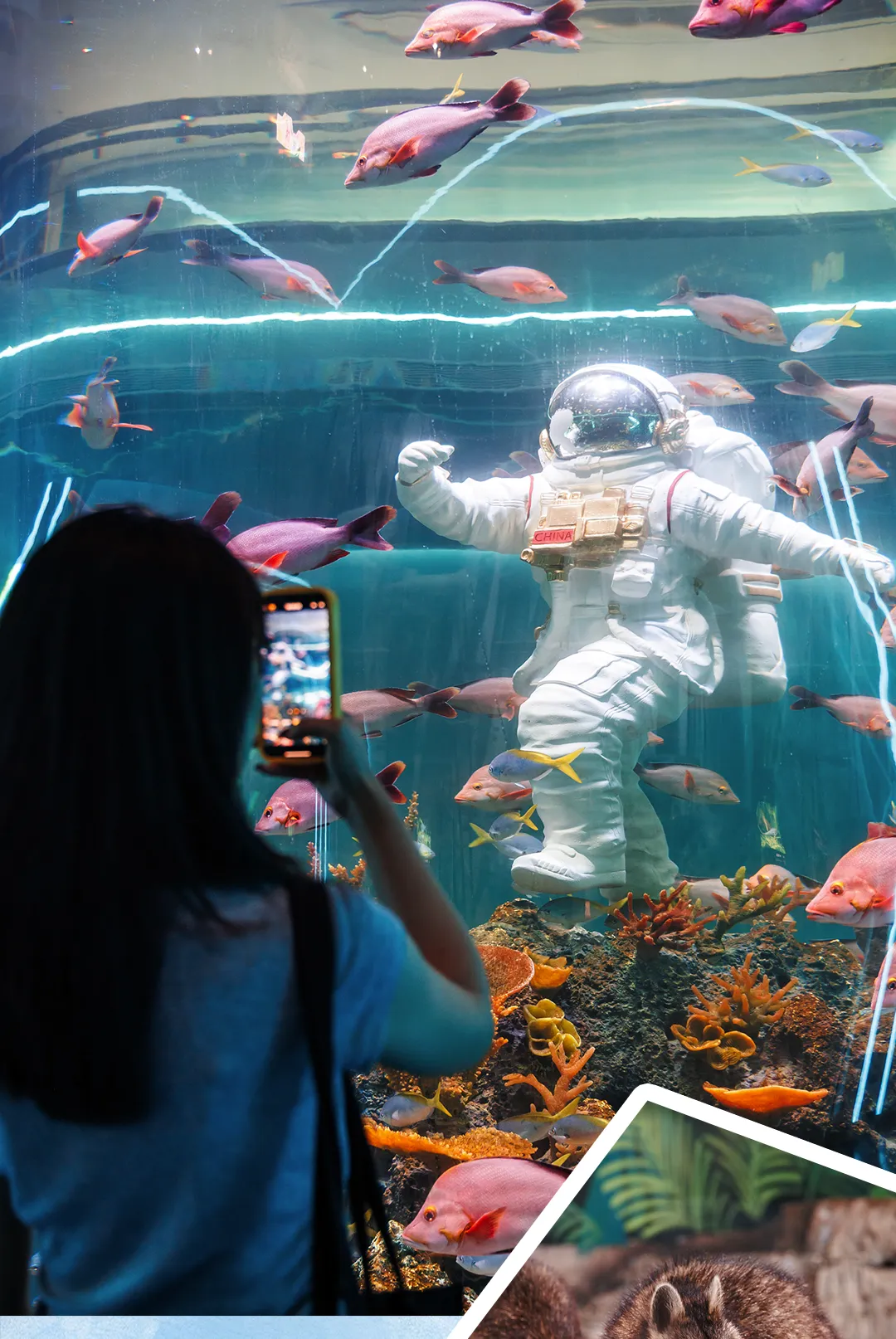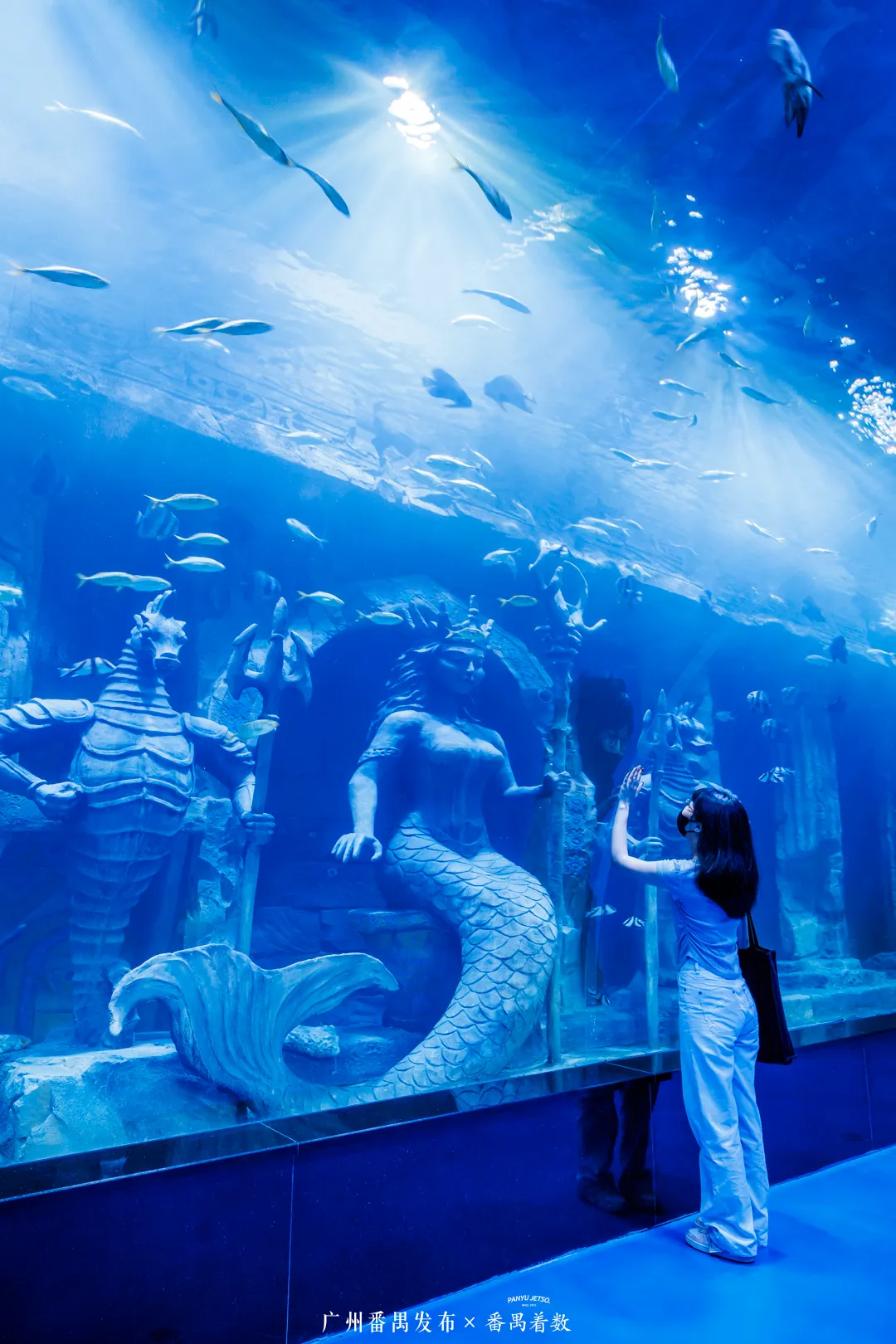 绝对会让你惊叹——成千上万条热带鱼在巨型圆柱中环绕游动,站在缸前拍照,仿佛被蓝色星球温柔拥抱。