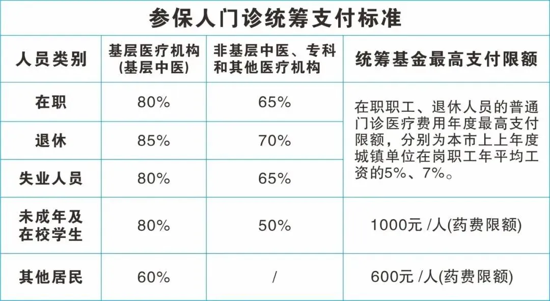 城镇职工符合普通门诊目录范围内的药费及诊疗费用,统筹基金按以下比例支付;城乡居民普通门诊药品目录范围内的基本医疗药费,由统筹基金按以下规定支付: