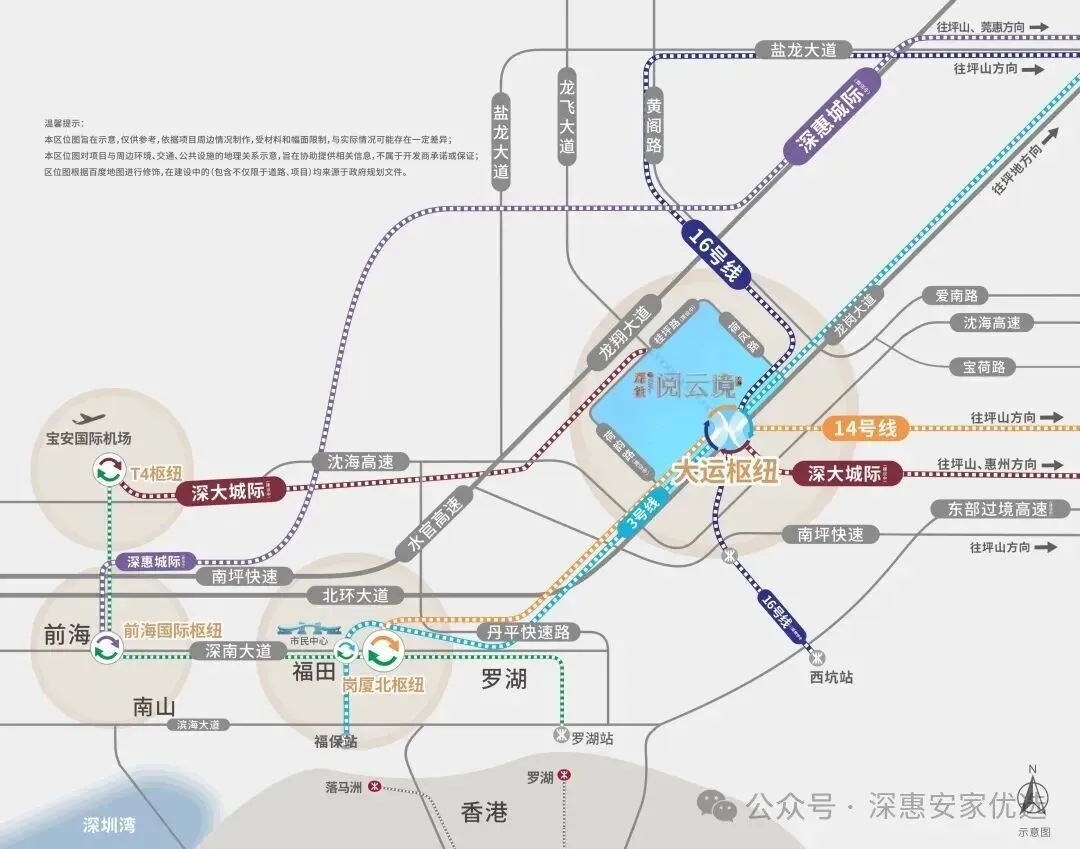 2、项目占据大运规划里面的重要交通枢纽位置,串联了地铁3/14/16号线,还有在建的深大城际等4条线路;