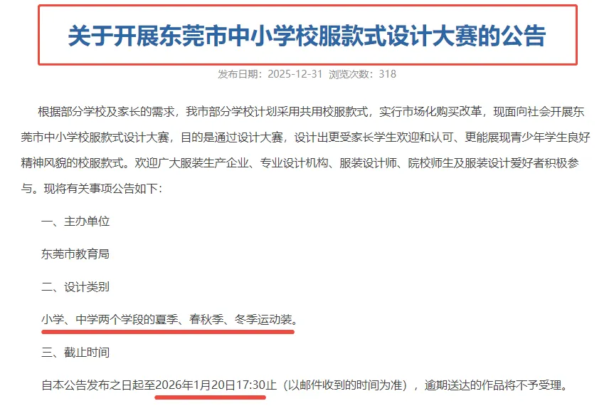 新年伊始,东莞市教育局宣布开展“中小学校服款式设计大赛”,面向全社会公开征集作品,并逐步推动全市共用校服款式。
