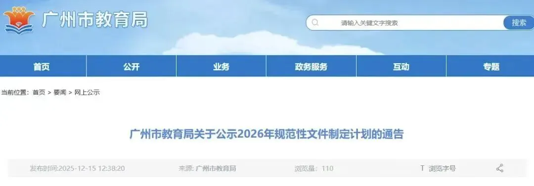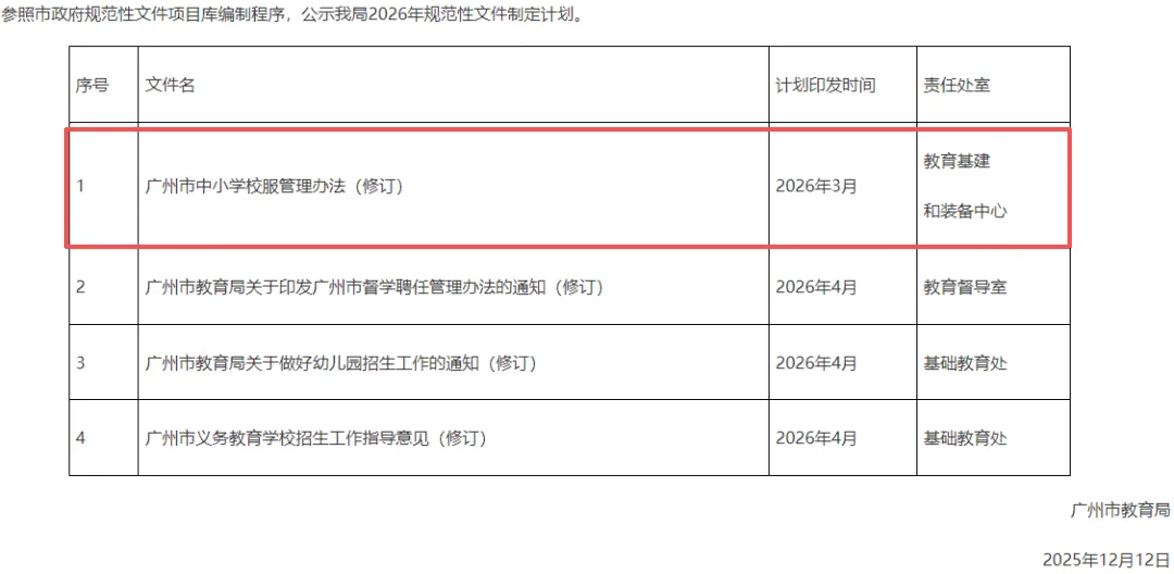 从广州市教育局近期公示的规范化文件制定计划可知,将于2026年3月发布《广州市中小学校服管理办法(修订)》。