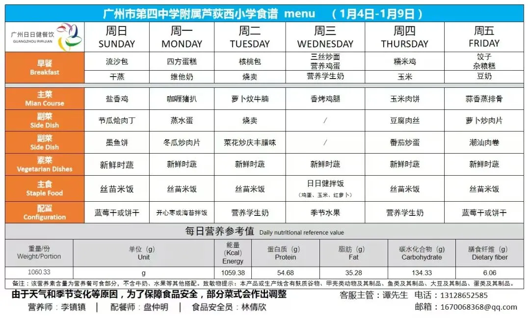 >广州市第四中学附属芦荻西小学2025年1月4日至1月9日师生菜谱