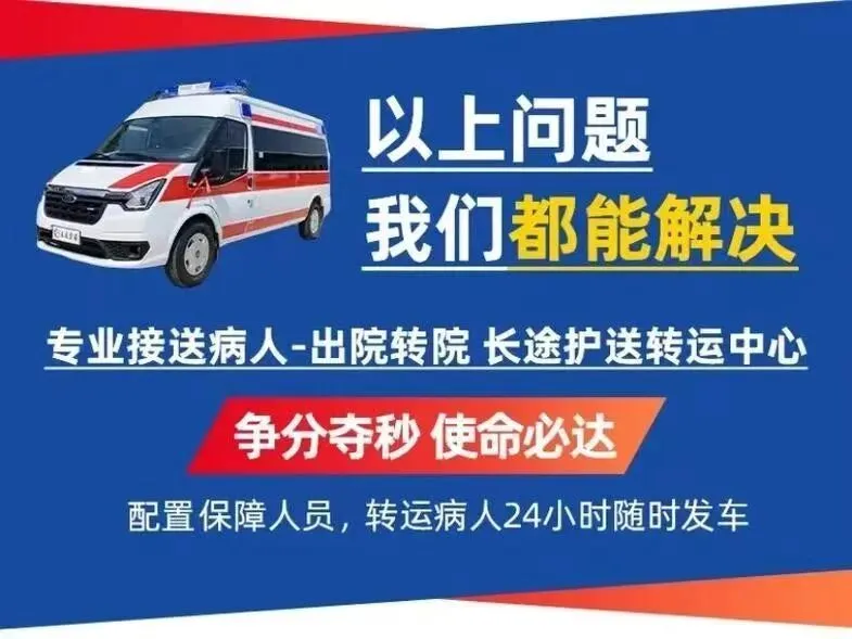 我们是救护车出租转运公司,120救护车接送病人预约护送。24小时为术后康复、危重患者及跨区域就医人群提供专业医疗转运服务,提供120救护车转运出租‖私人120救护车(非急救)‖跨省长途转运‖危重病人转运‖市内转运‖术后康复病人转运‖高铁病人转运‖患者返乡‖大型活动赛事保障‖配备ICU设备:呼吸机▪心电监护仪▪吸痰器•微量泵•氧气▪急救药箱▪专业医护团队
