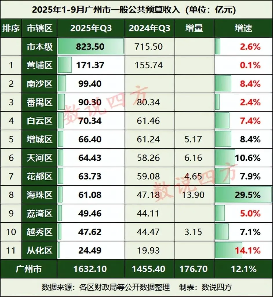 3、白云区2025年前三季度财政收入70.34亿元,稳居广州市第四位,相对于增城区(66.4亿元)、天河区(64.43亿元)的领先优势明显扩大,全年财政收入有希望冲击百亿。