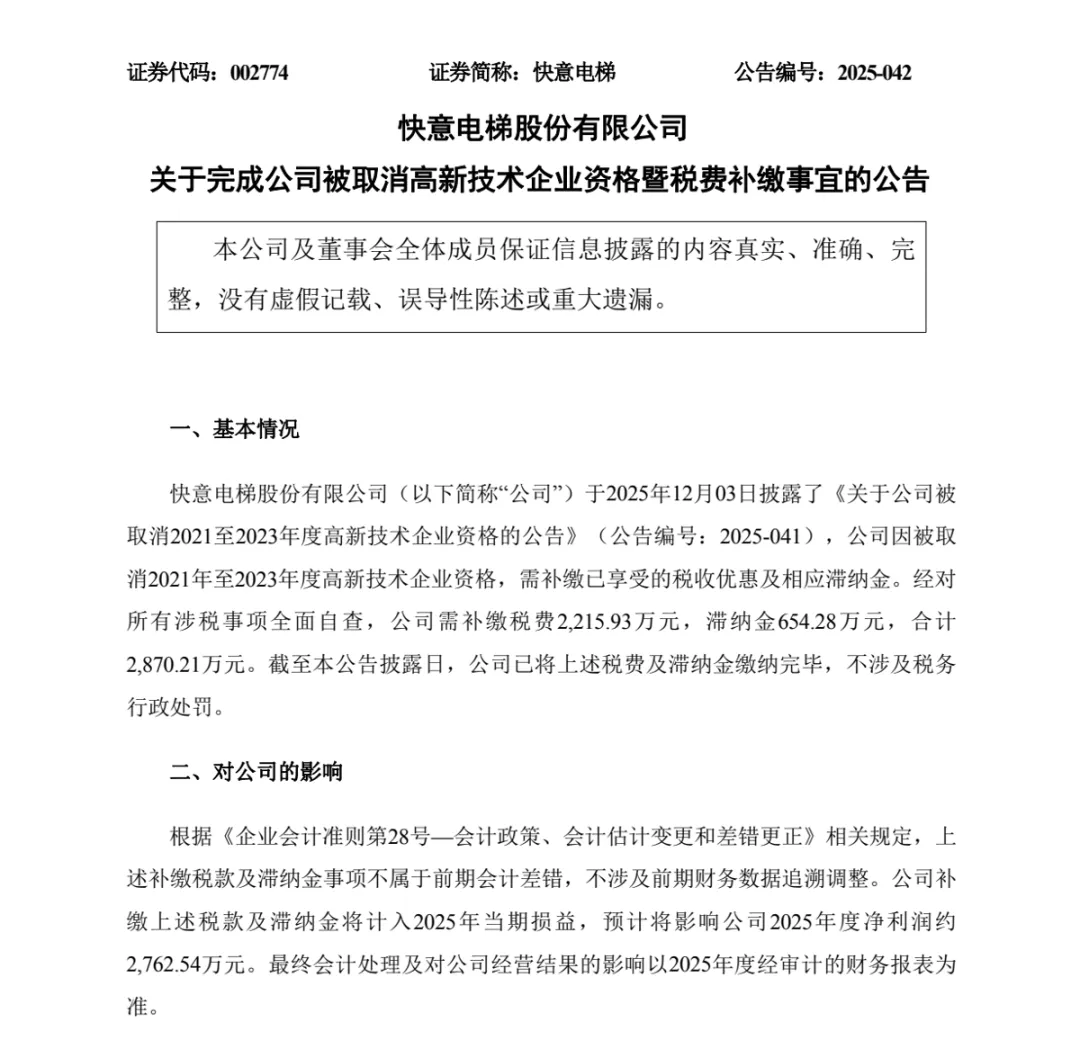 此前12月12日,快意电梯发布公告称,公司因被取消2021年至2023年度高新技术企业资格,需补缴已享受的税收优惠及相应滞纳金。经对所有涉税事项全面自查,公司需补缴税费2,215.93万元,滞纳金654.28万元,合计2,870.21万元。截至本公告披露日,公司已将上述税费及滞纳金缴纳完毕,不涉及税务行政处罚。补缴税款及滞纳金将计入2025年当期损益,预计将影响公司2025年度净利润约2,762.54万元。