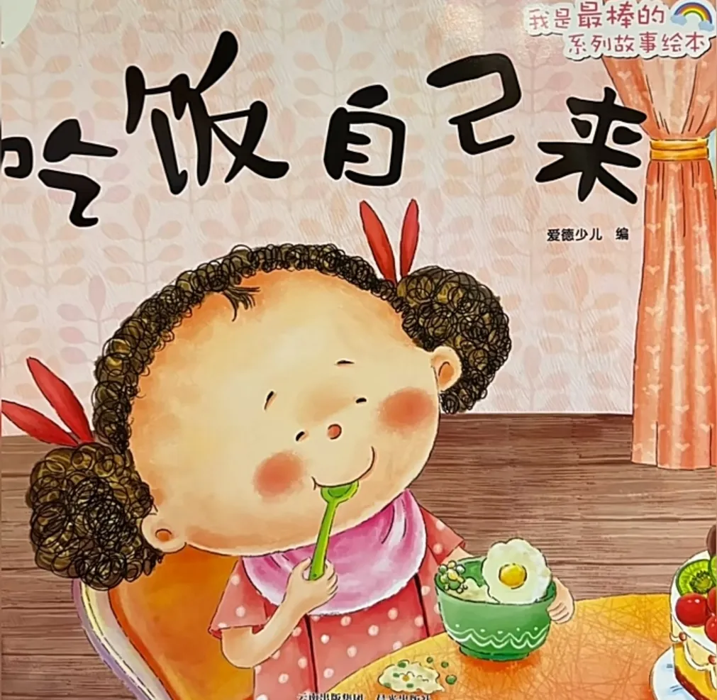 独立吃饭,不仅可以锻炼孩子的手部精细动作,同时也可以初步培养孩子的专注力。家长可以通过儿歌或绘本来引导孩子。