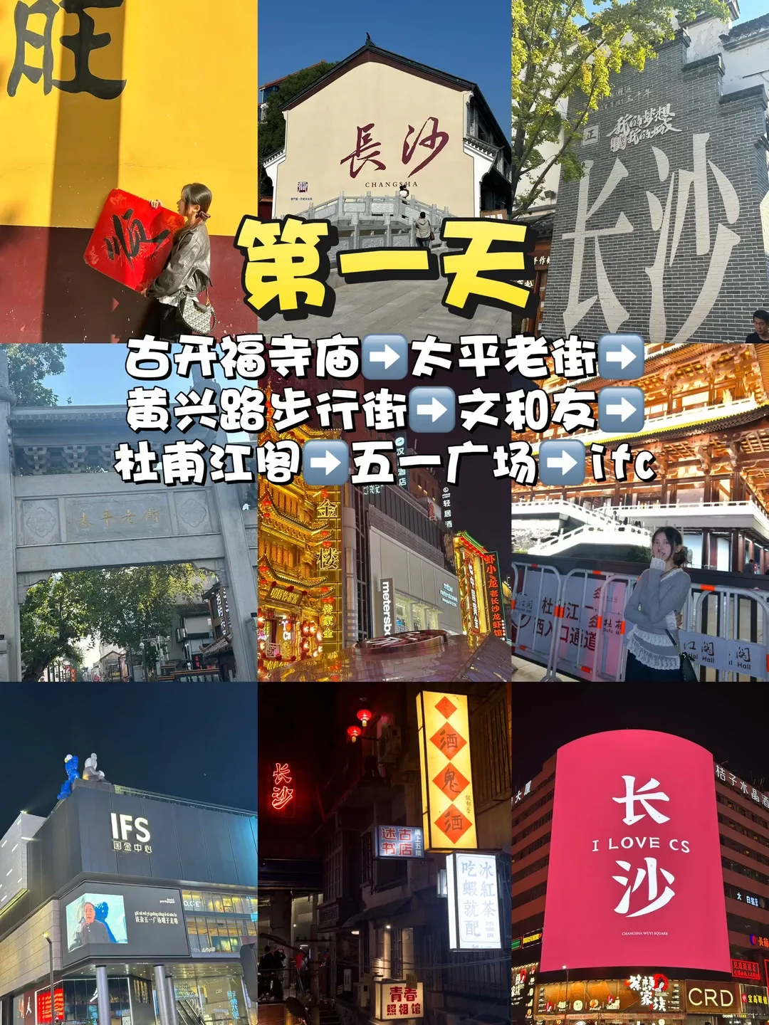 第二站📍:去各种街逛逛走走吃吃小吃,太平老街、黄兴路可以下午去,大概6点的时候可以去杜甫江阁等开灯拍照,看看夜晚的湘江,然后可以去文和友、五一广场、ifc这些路走走(人很多很热闹,记得穿舒服一点的鞋子,因为一直要走路!!)差不多就可以回酒店休息了