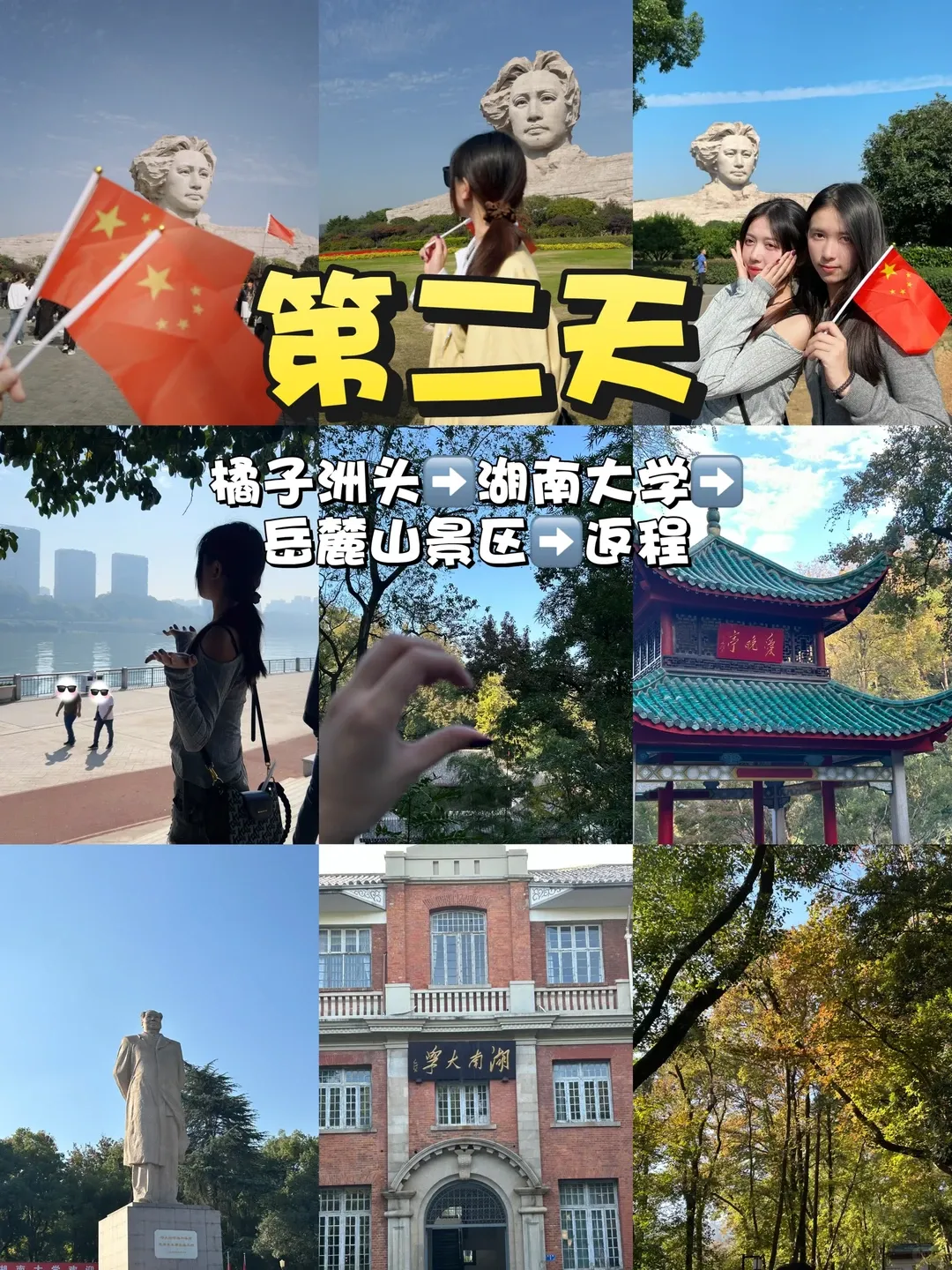 第一站📍:上午橘子洲头景区(提前三天预约)观光车🎫来回40,学生半价,这个我觉得还是有必要买,里面挺大的!先一路坐到终点站再走几百米就到毛爷爷雕像了,出片位置不止一个!可以找一些阳光不会直视眼睛的地方拍,不然你就会得到眯眯眼的废片拍完有时间的话可以逛逛里面其他的!