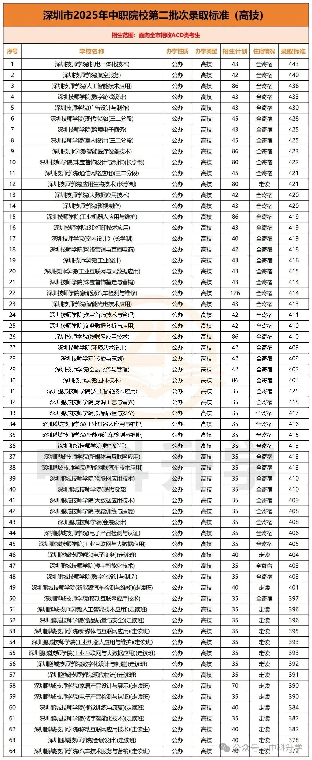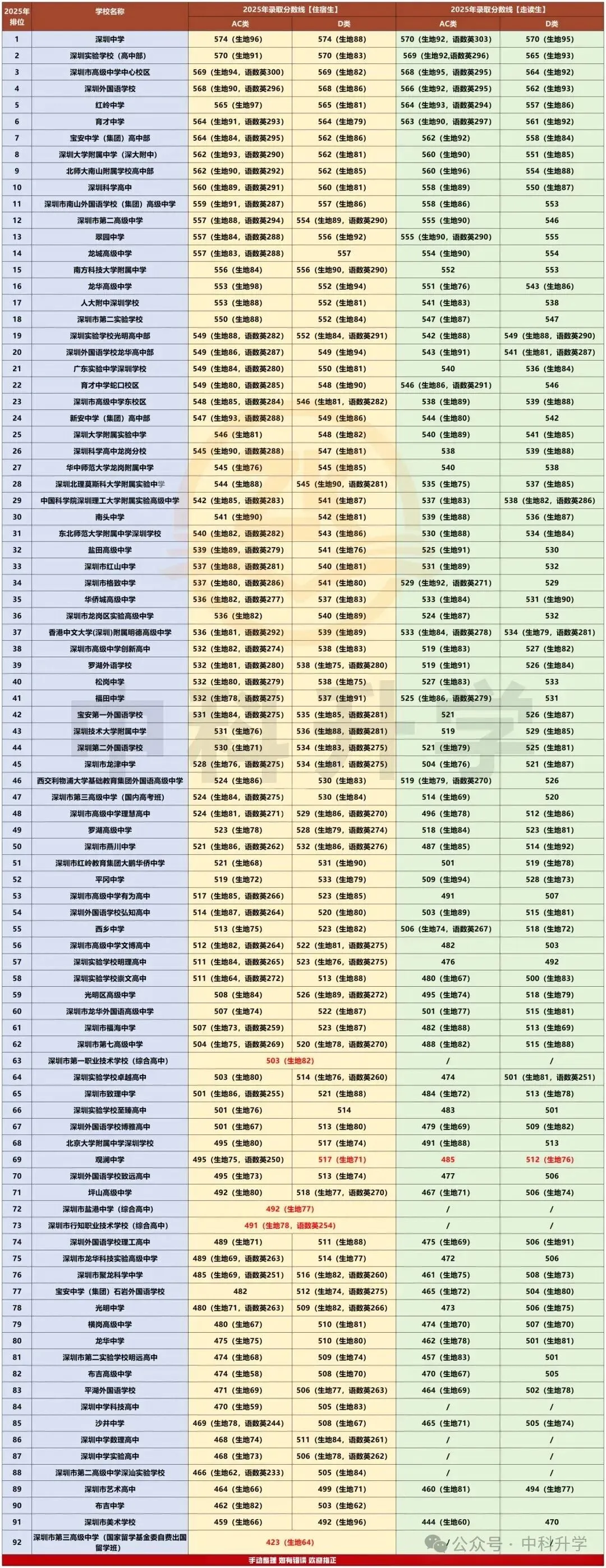 录取分数线方面,2025 年深圳公办普高(不含三高出国班)最低控制线划定:AC 类考生 459 分(走读 444 分),D 类考生 492 分(走读 470 分)。