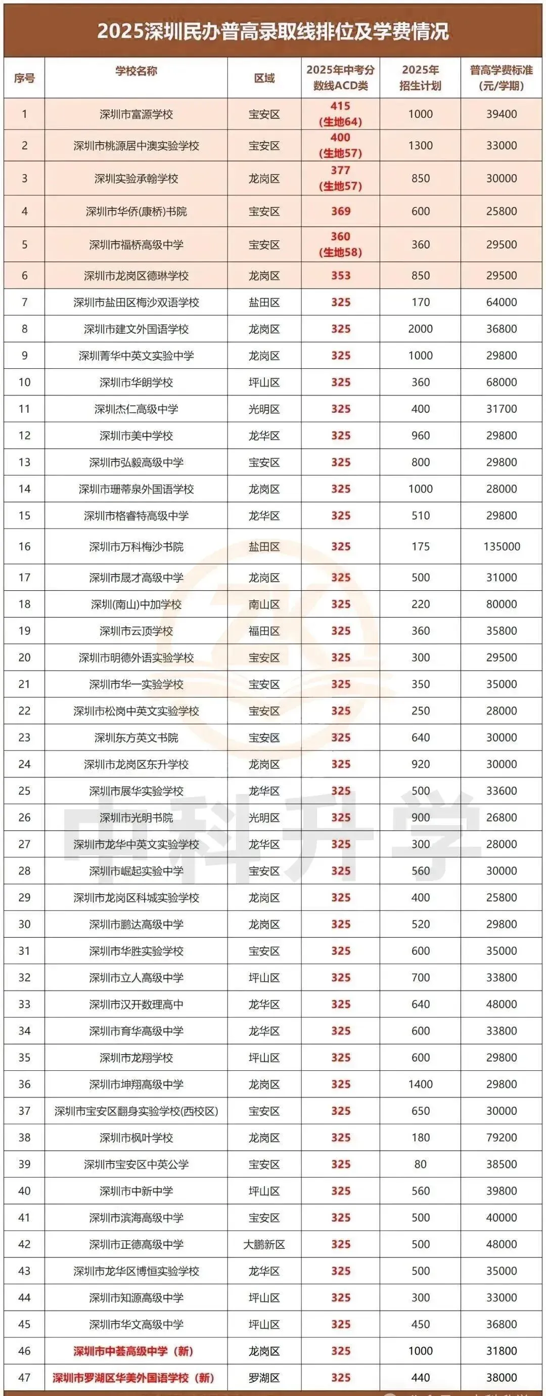 2025年深圳民办普高第一次划线录取情况2025年深圳中考第一次划线录取中,共有47所民办普高参与招生,其中深圳市中荟高级中学、深圳市罗湖区华美外国语学校2所高中为新增院校,首次纳入第一批招生范畴。本次民办普高合计招生计划28775人,较上一年度增加2325人,招生规模稳步扩大。