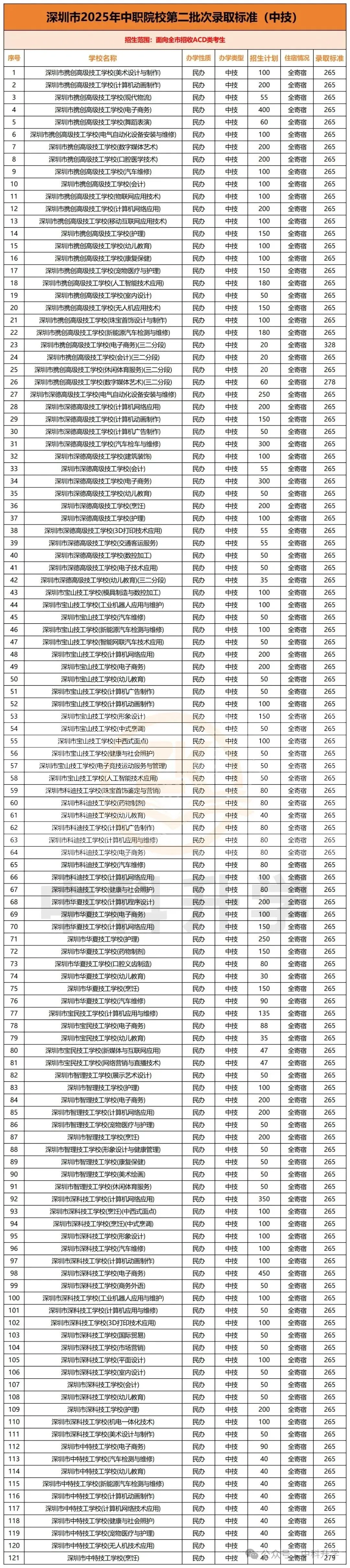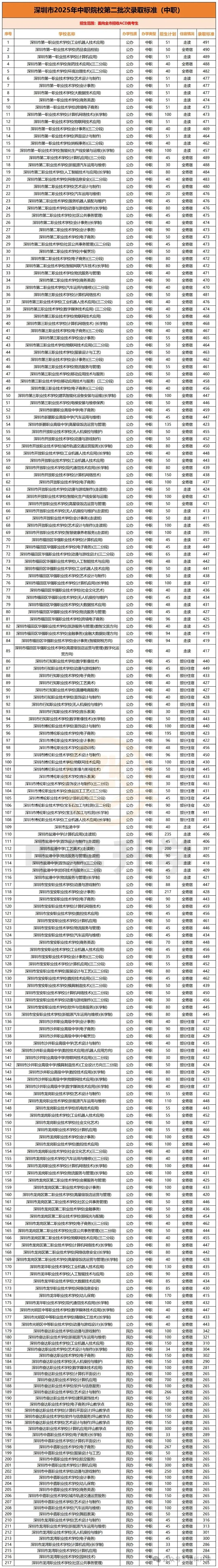 2025 年深圳共有 29 所中职技工类学校参与中考招生,具体院校分类如下:公办中职学校 15 所、民办中职学校 3 所、公办高技学校 2 所、民办中技学校 9 所。各校各批次专业的录取分数线汇总如下。