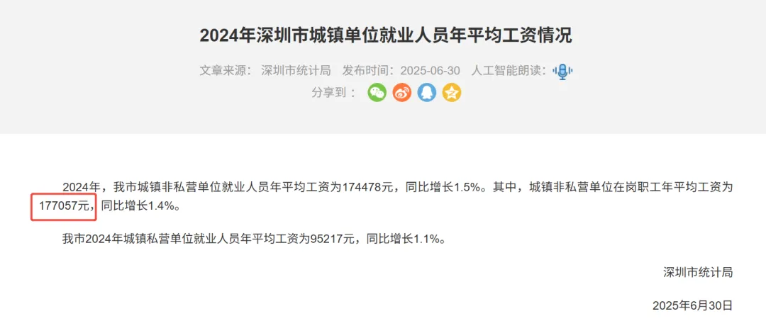 ✅深圳市上上年度在岗职工年平均工资(2024年)