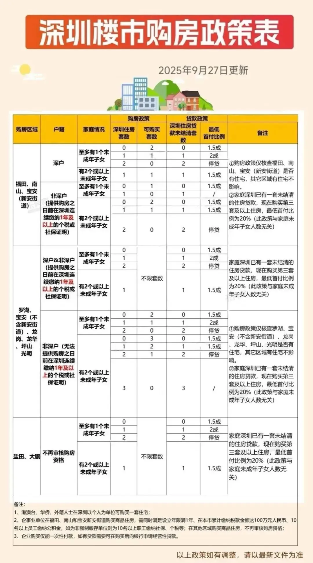 2025年9月5日:9月5日,深圳出台新政:进一步松绑限购,罗湖、宝安西乡不再限购,部分区域不限套数;首套二套利率持平;单身人士购房等同家庭;企事业单位可在全市购买住宅,且非限购区不再审核购房资格等。